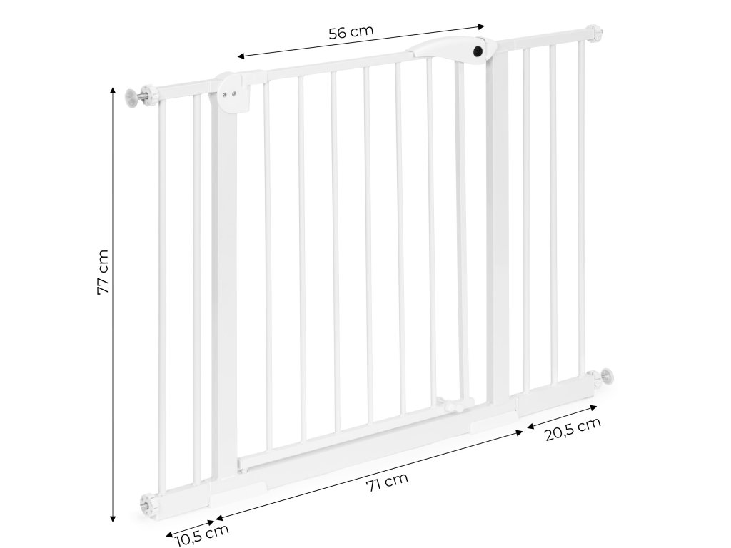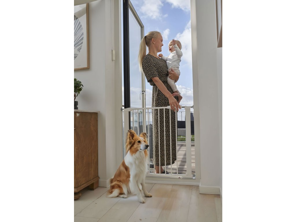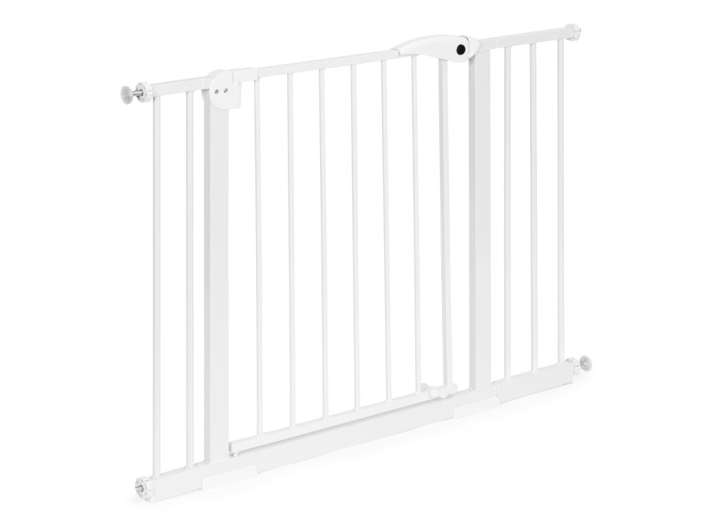 Ideální pro zabezpečení schodů a vchodů, účinně brání přístupu dětem a zvířatům. Šířka nastavitelná od 74 s možností rozšíření na 105 cm pomocí přídavných panelů a dorazových šroubů. Pevný, práškově lakovaný ocelový rám s otvíratelnou brankou zajišťuje odolnost a estetický vzhled. Brána může být upevněna roztažením pomocí šroubů nebo pomocí speciálních podložek a montážních kolíků, které jsou součástí sady, aby byla trvale připevněna.