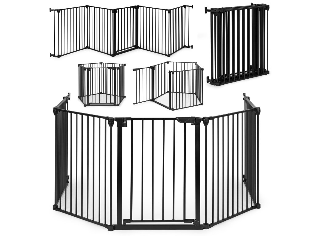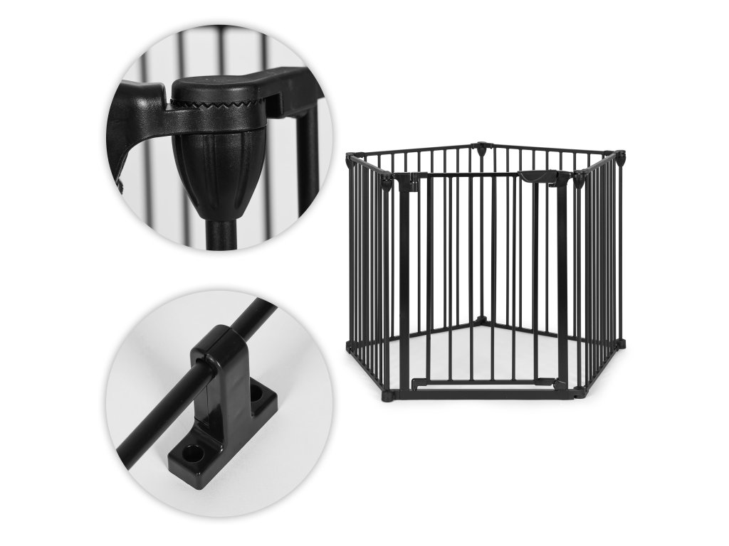 Kovová bezpečnostní brána značky ECOTOYS se skládá z 5 panelů, z toho jeden s dvířky. Flexibilní konstrukce umožňuje vytvořit bezpečný prostor v domácnosti pro děti a domácí mazlíčky. Panely lze připevnit ke zdi (potřebné montážní prvky jsou součástí balení) nebo spojit dohromady a vytvořit tak uzavřený prostor. Každý závěs je vybaven speciální pojistkou, která zajišťuje panel a usnadňuje tak vytvoření požadovaného tvaru zábrany.