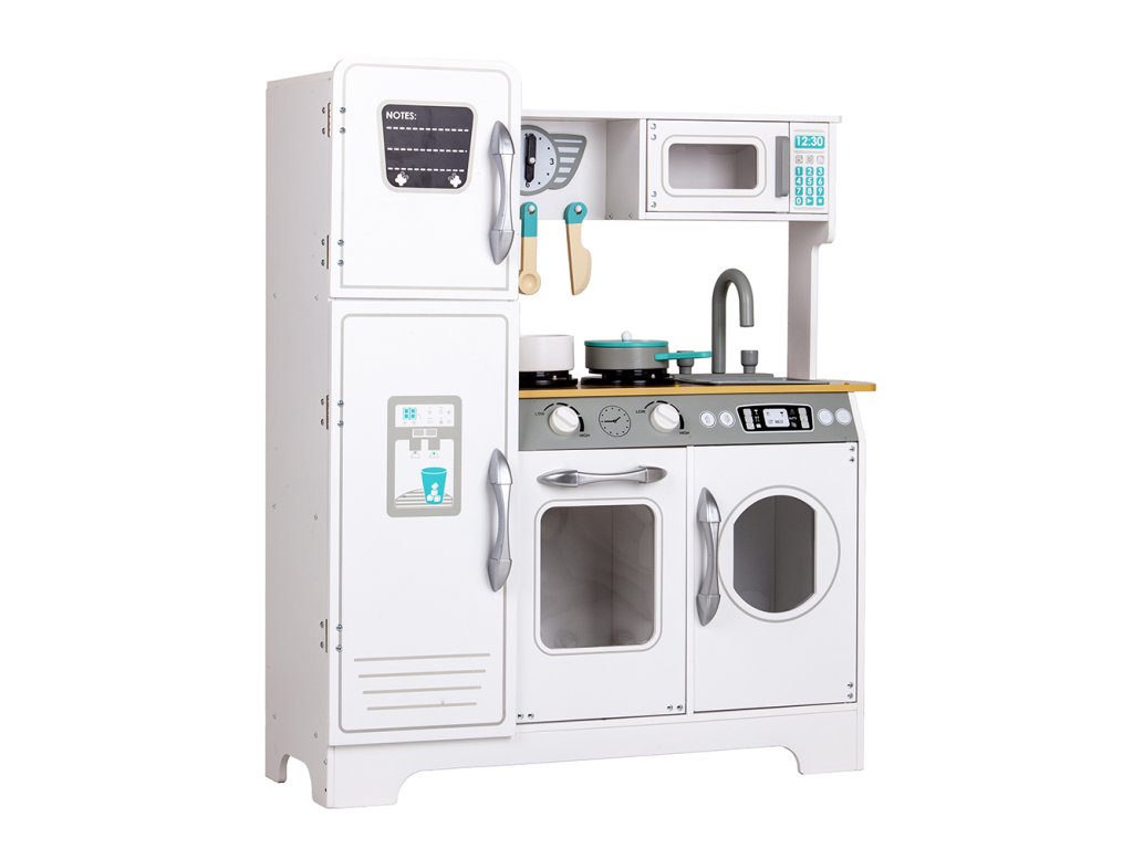 Dětská kuchyňka je vyrobena ze dřeva a MDF desek. Kuchyňka má vše, co je potřeba k přípravě jídel, a navíc je vybavena otevíratelnou pračkou. Kuchyňka umožňuje hraní s otevíratelnou troubou, ledničkou, mikrovlnnou troubou, velkou skříňkou, hořáky a kohoutkem s dřezem. Sada obsahuje kromě kuchyňky také 5 dřevěných doplňků. Všechny dřevěné prvky jsou 100% bezpečné pro děti – bez ostrých hran.
