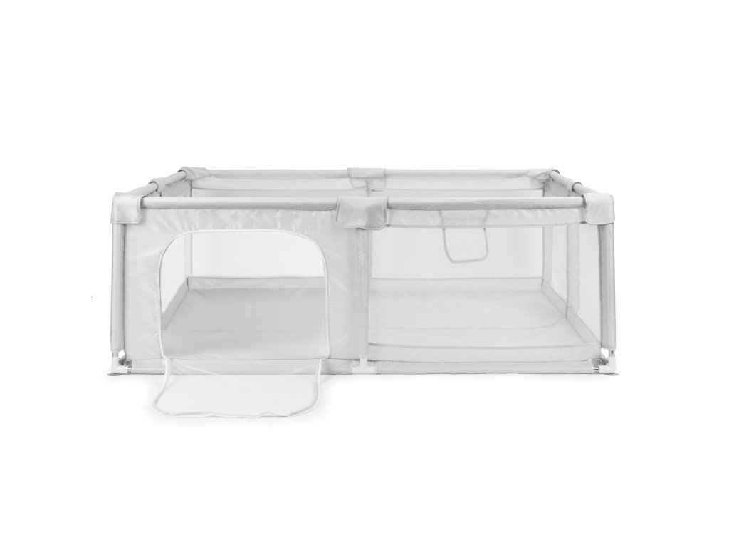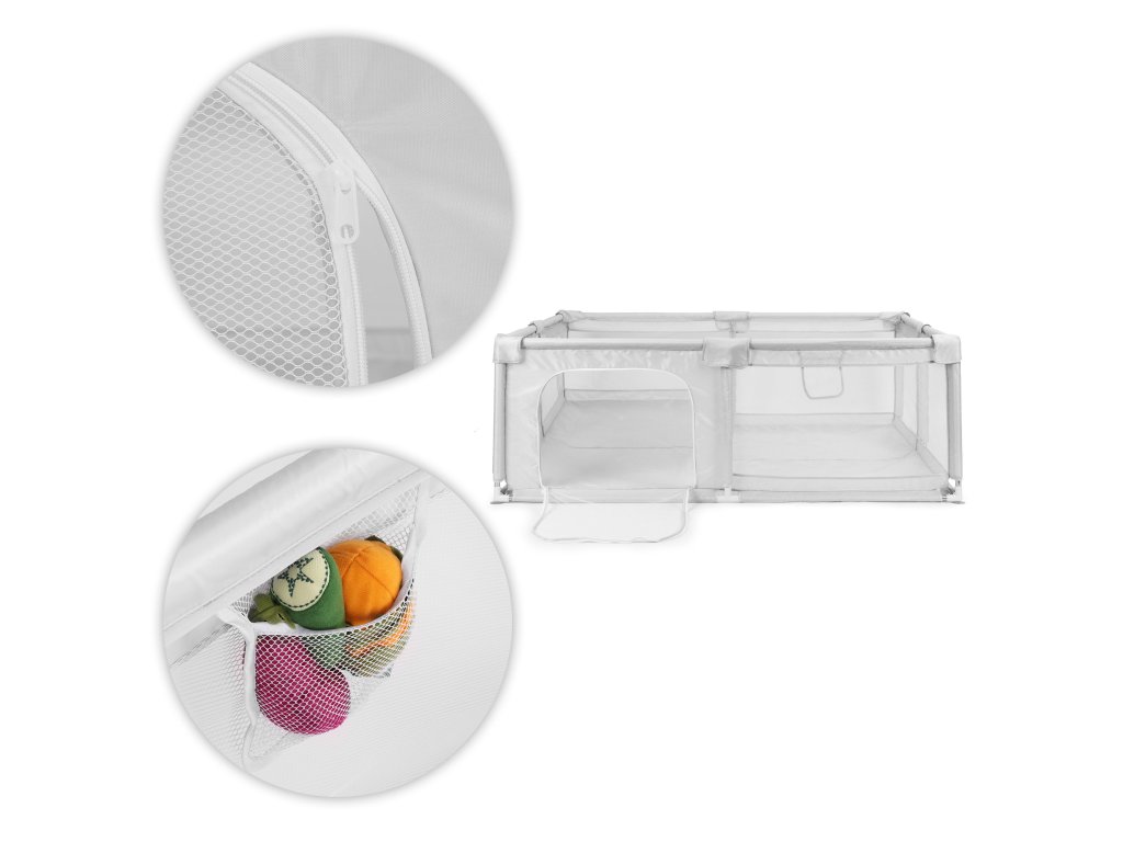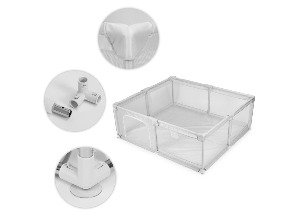 Ohrádka má stabilní rám z nerezové oceli a všechny spoje jsou chráněny měkkou pěnou, což eliminuje riziko úrazu. Absence ostrých hran a bezpečné materiály zajišťují vysokou úroveň ochrany. Síťované stěny zaručují prodyšnost a umožňují neustálý dohled nad dítětem. Boční vstup se zámkem všitým z vnější strany znemožňuje dítěti samostatný výstup.