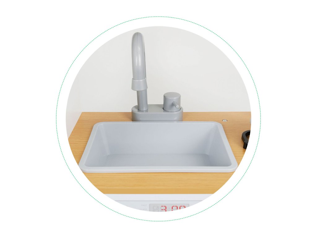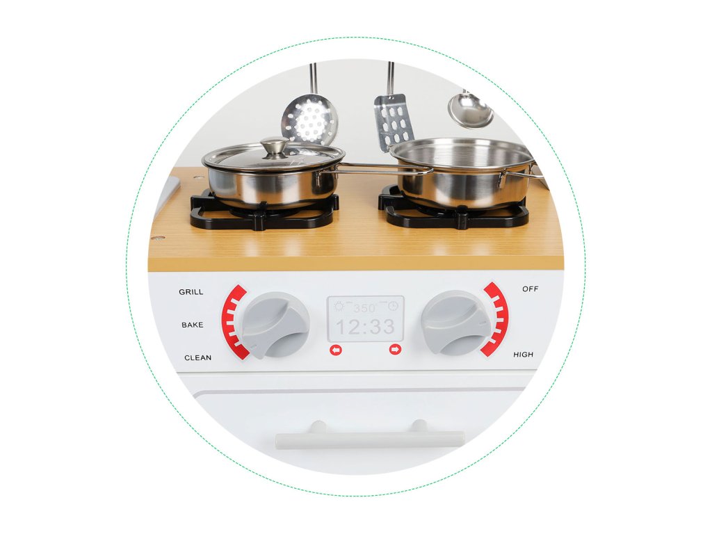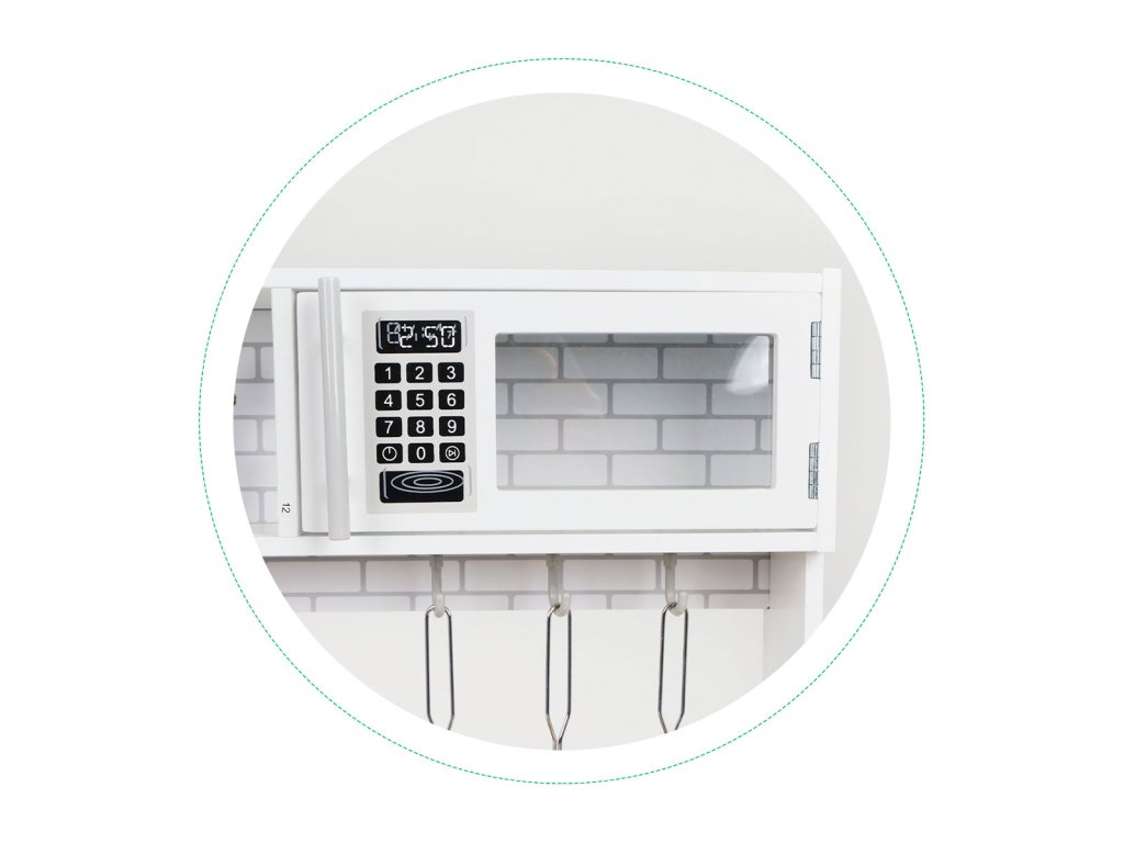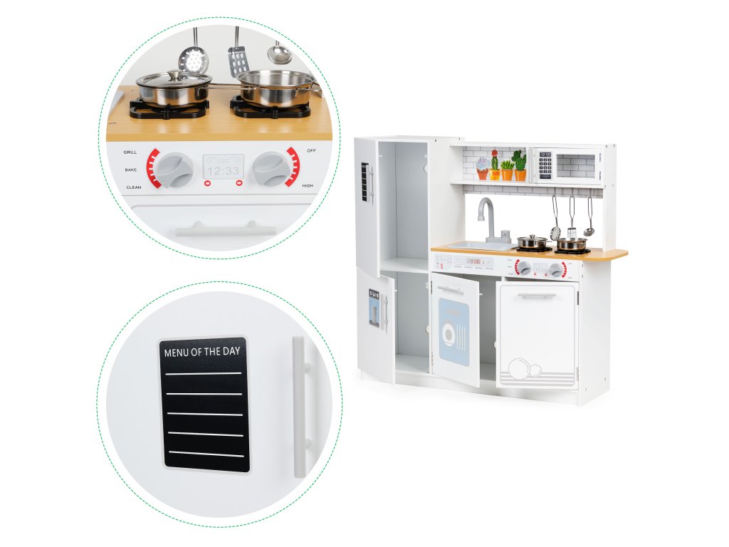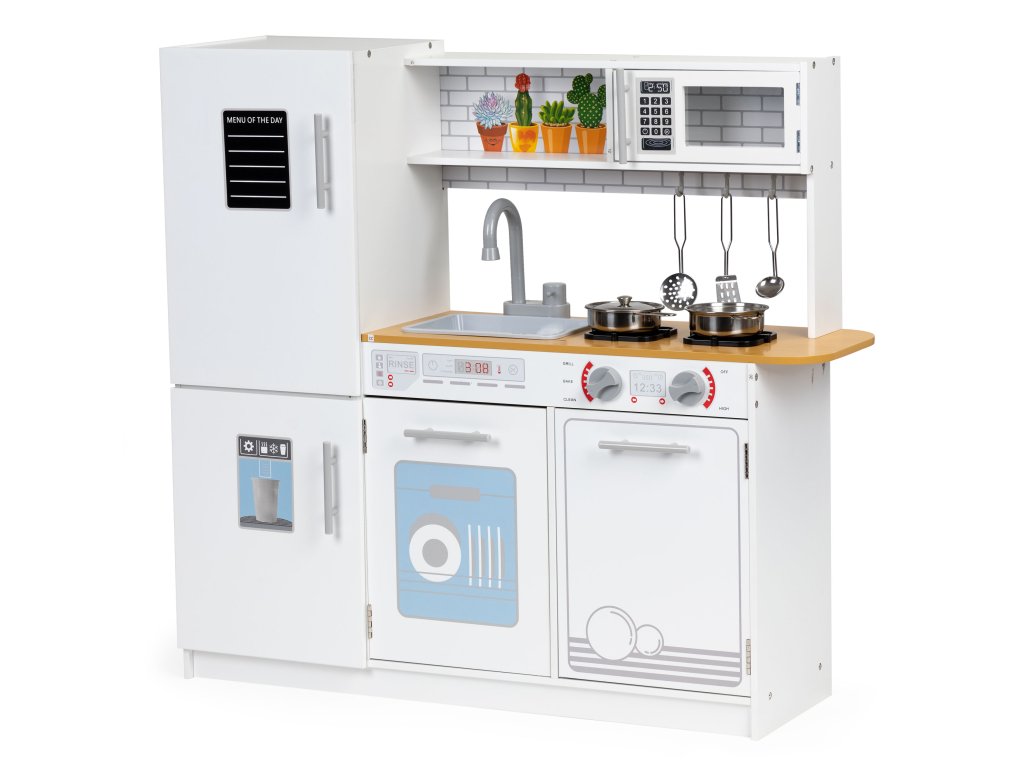 Všechny děti rády napodobují dospělé, díky této kuchyni bude mít vaše ratolest příležitost vžít se do role kuchaře/kuchařky. Šéfkuchař má k dispozici mimo jiné hořáky s otočnými knoflíky pro nastavení správné teploty. Pod pracovní deskou se nachází trouba a myčka nádobí. V horní části je namontována otevíratelná mikrovlnná trouba a další police na nádobí. V kuchyni samozřejmě nesmí chybět prostorná lednička s mrazákem a místo na zapisování nákupního seznamu.