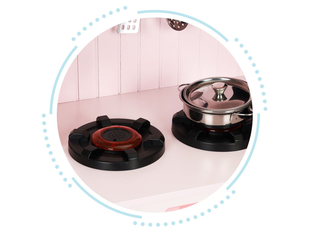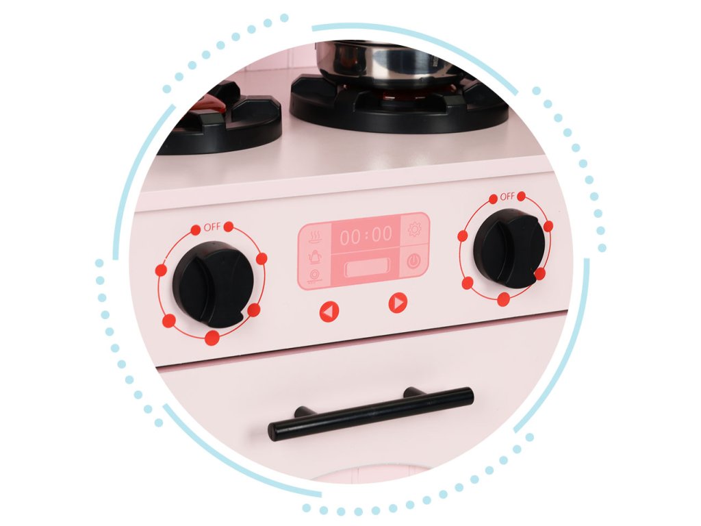 Kuchyně je vybavena otočnými knoflíky, které umožňují simulovat provoz sporáku a trouby. Děti mohou regulovat teplotu, měnit nastavení hořáků, což jim umožňuje vytvářet různé scénáře a hrát si na vaření, aniž by hrozilo nebezpečí popálení. Je to skvělá příležitost pro kreativní hru a experimentování v bezpečném prostředí.