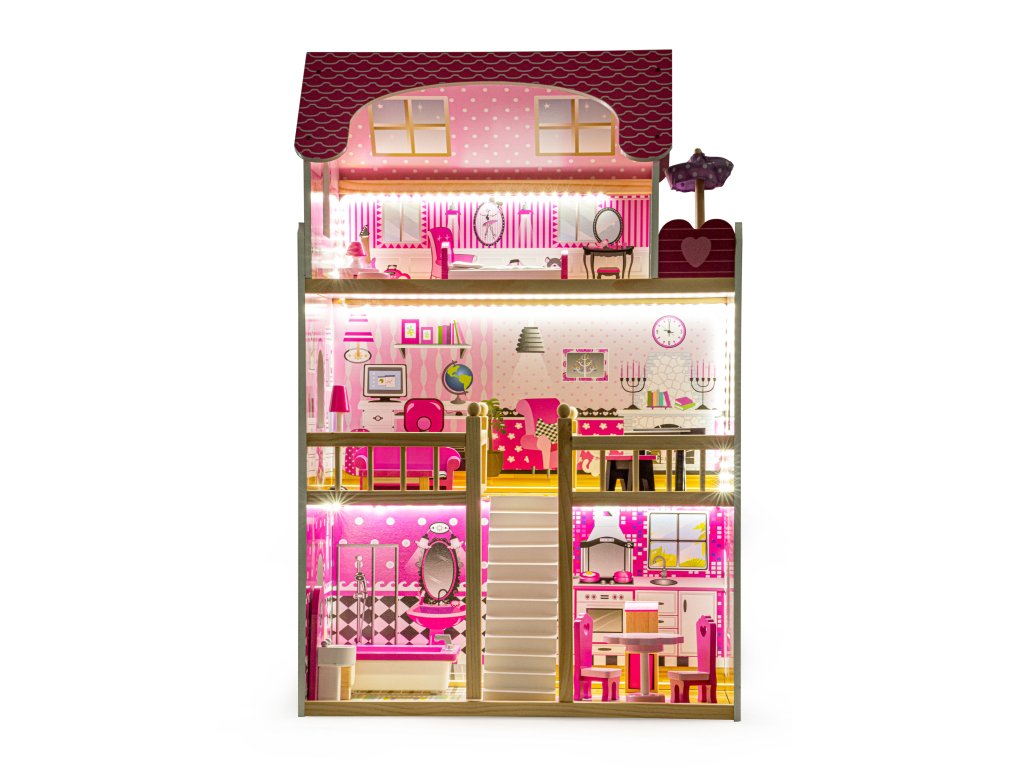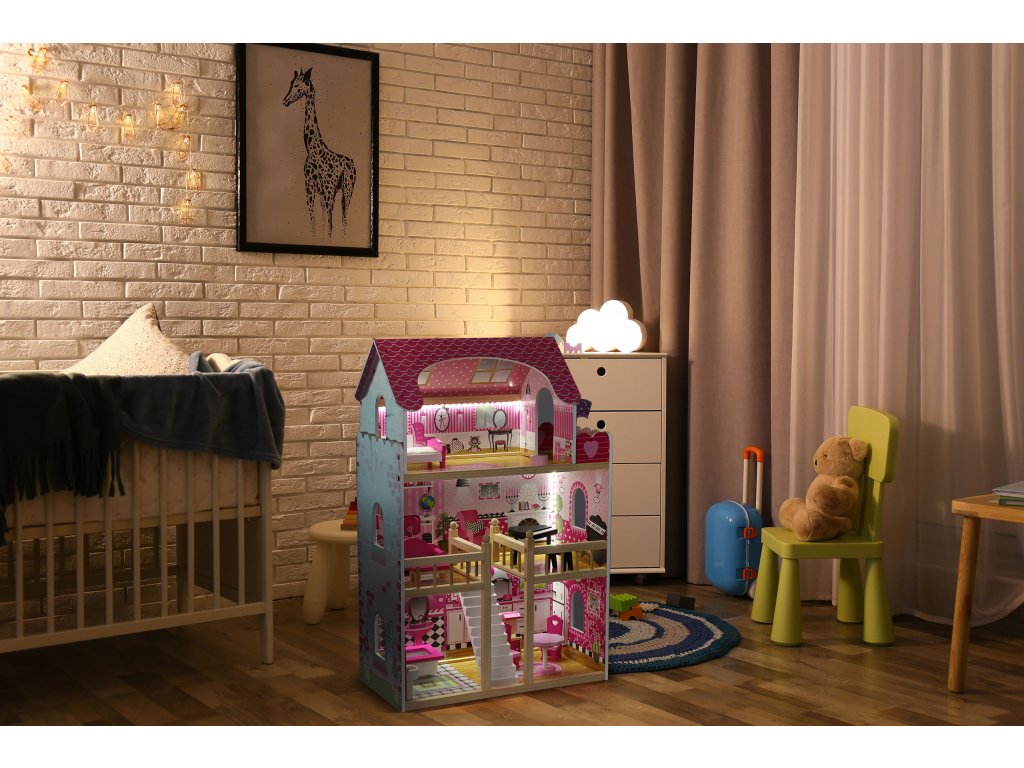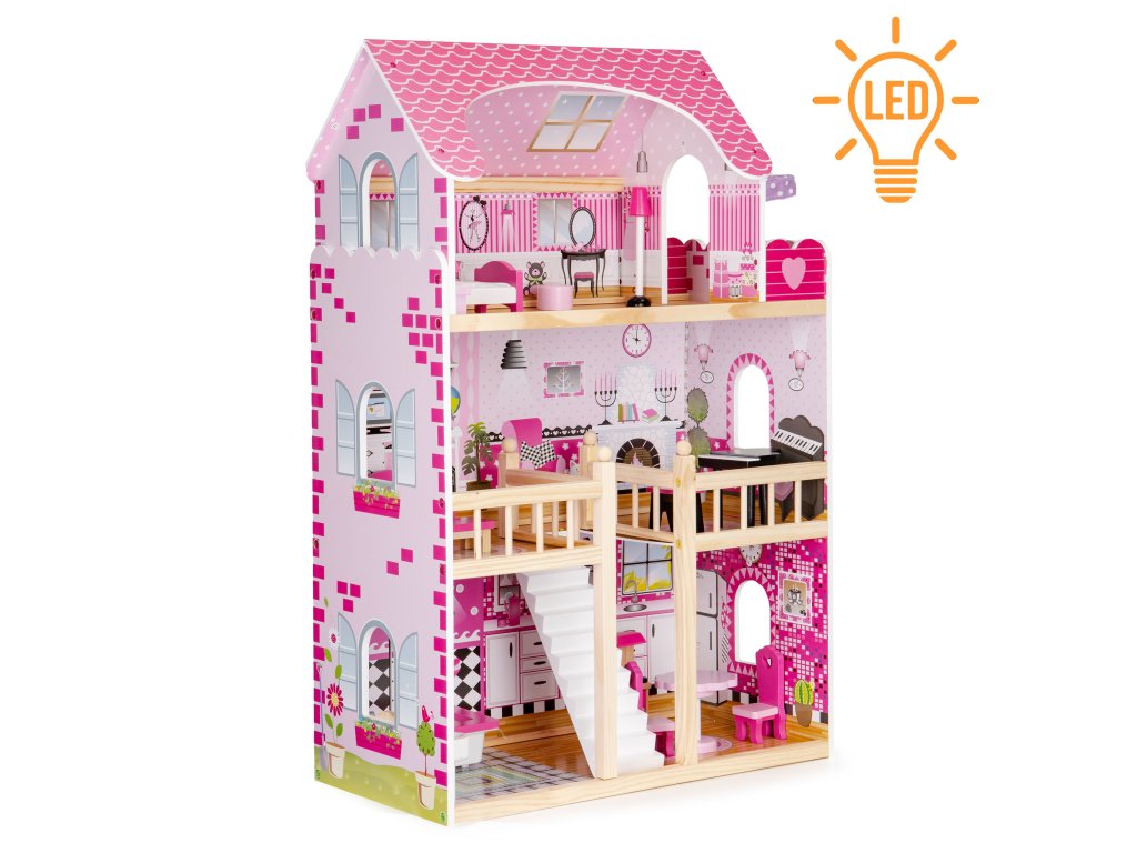 Třípodlažní domek pro panenky od ECOTOYS je kombinací klasického designu a moderních řešení. Obsahuje 5 stylových pokojů, z nichž každý je zařízen v jiném stylu. Díky realistickému znázornění interiérů a dodatečnému LED osvětlení je hra ještě poutavější. Profilovaná střecha zvyšuje komfort používání a celá konstrukce je vyrobena z odolného dřeva, což zajišťuje bezpečnost a stabilitu.