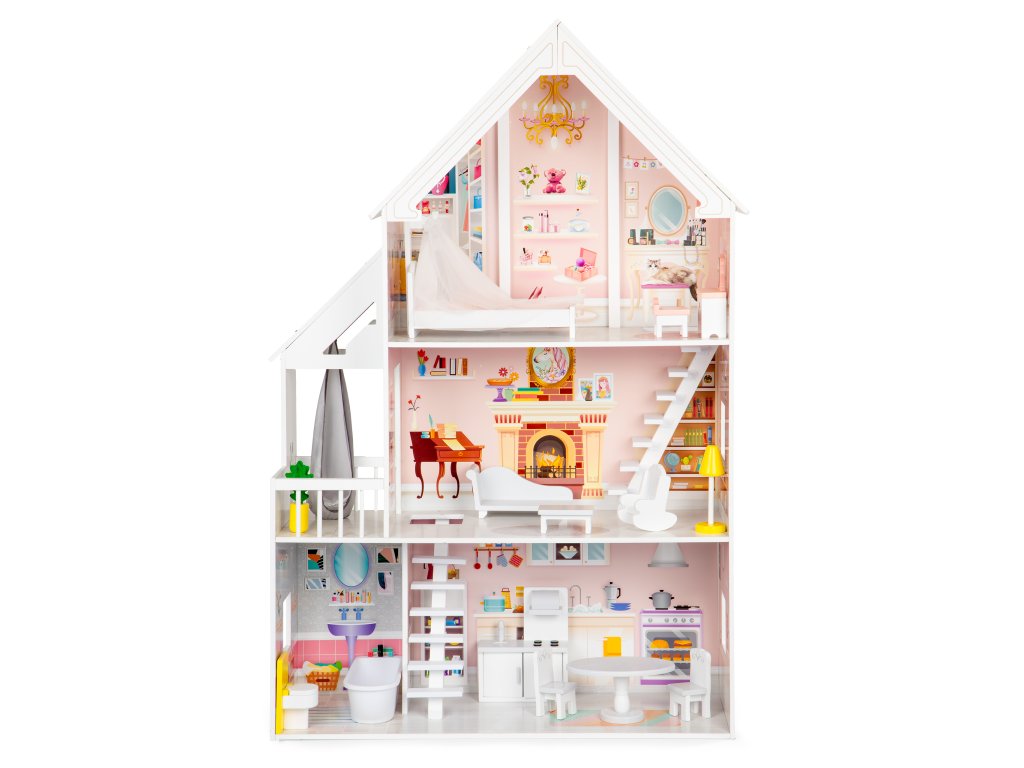 Stabilní a odolná konstrukce domečku je vyrobena ze dřeva a MDF desek. Všechny prvky hračky jsou bez ostrých hran, díky čemuž jsou pro dítě 100% bezpečné. Domeček má 3 velká patra, na kterých se nachází 5 místností, jako jsou: obývací pokoj, kuchyně, balkon, ložnice a koupelna. V sadě najdeme až 15 dřevěných kusů nábytku, které lze libovolně přemisťovat a tím měnit uspořádání interiéru. Produkt je určen k samostatné montáži podle srozumitelného návodu.