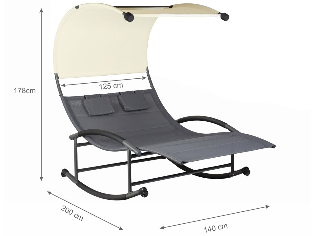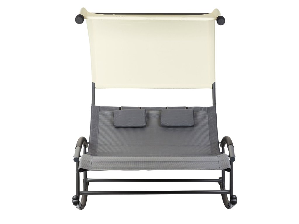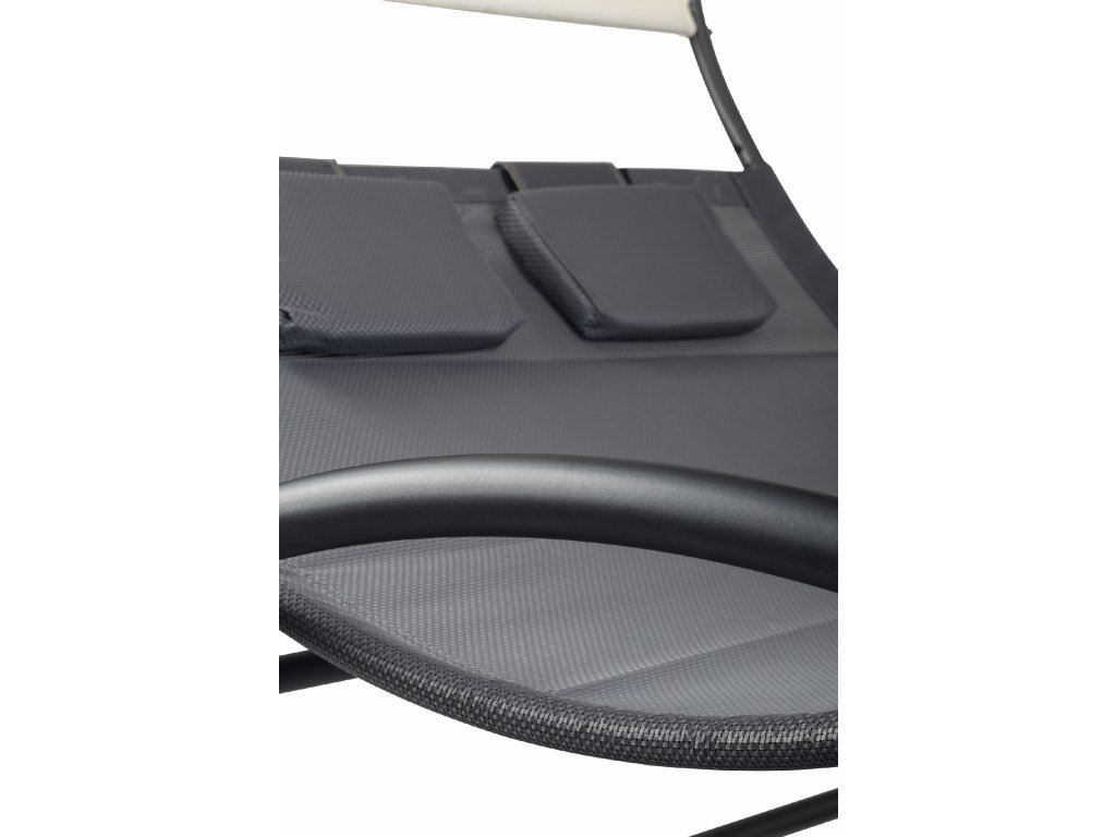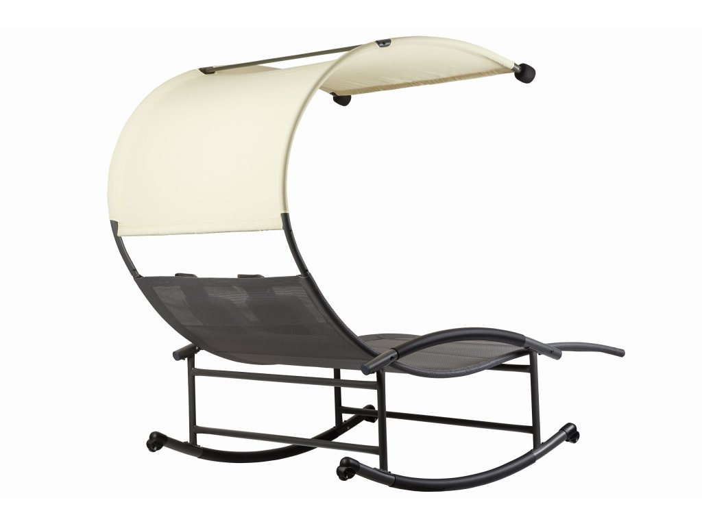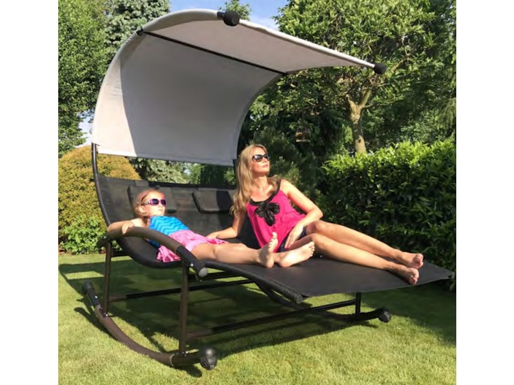Speciálně tvarovaný rám lehátka umožňuje jemné houpání při ležení. Velké rozměry celého lehátka umožňují odpočinek pro dvě osoby. Velký střech zajistí ochranu před škodlivým UV zářením a vytvoří příjemný stín. Materiál, který propouští vodu, a práškově lakovaný rám zaručují odolnost proti povětrnostním vlivům. Lehátko je navíc vybaveno dvěma měkkými opěrkami hlavy a kolečky, které umožňují přemístění celé konstrukce.