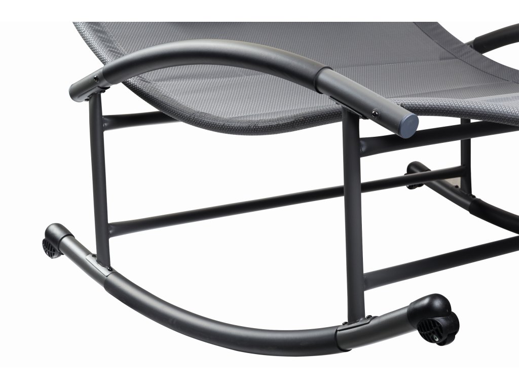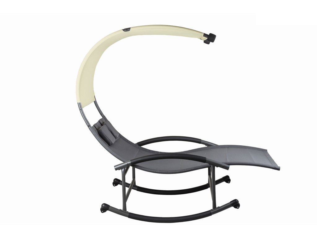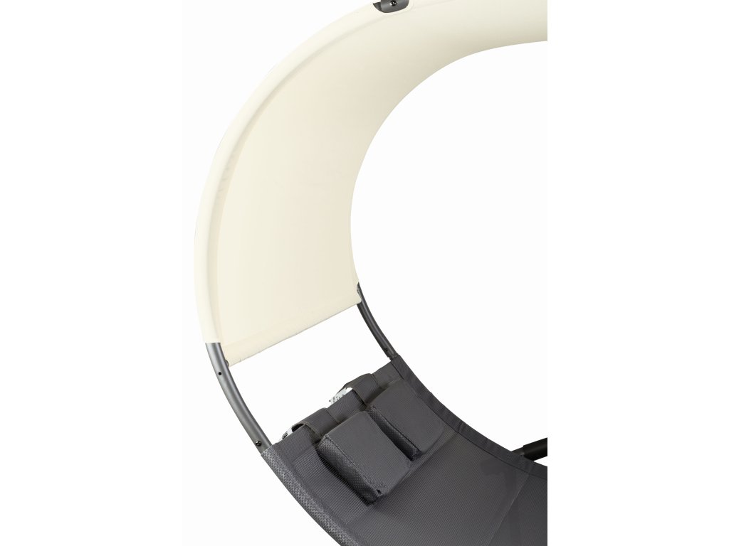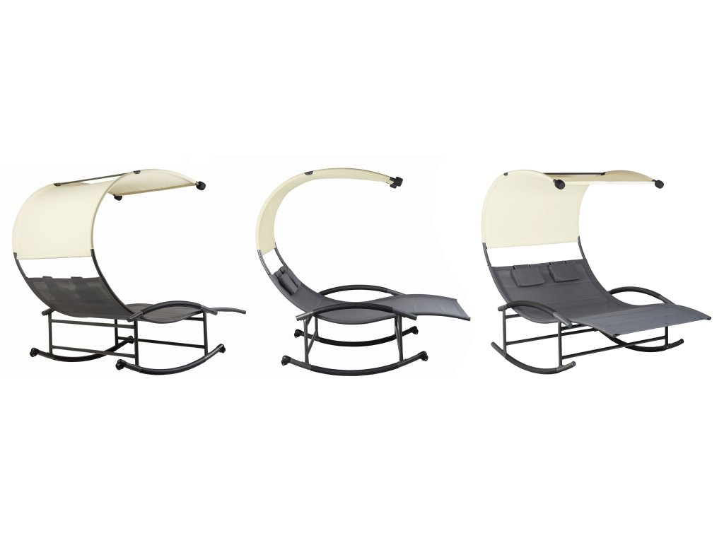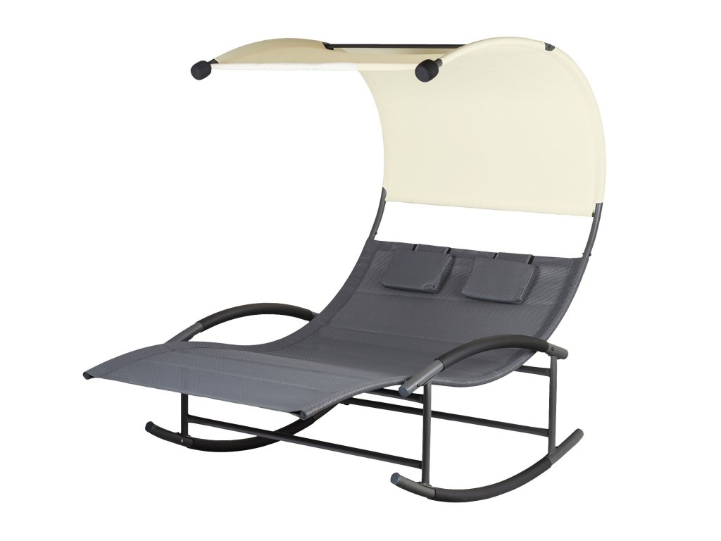 Speciálně tvarovaný rám lehátka umožňuje jemné houpání při ležení. Velké rozměry celého lehátka umožňují odpočinek pro dvě osoby. Velký střech zajistí ochranu před škodlivým UV zářením a vytvoří příjemný stín. Materiál, který propouští vodu, a práškově lakovaný rám zaručují odolnost proti povětrnostním vlivům. Lehátko je navíc vybaveno dvěma měkkými opěrkami hlavy a kolečky, které umožňují přemístění celé konstrukce.