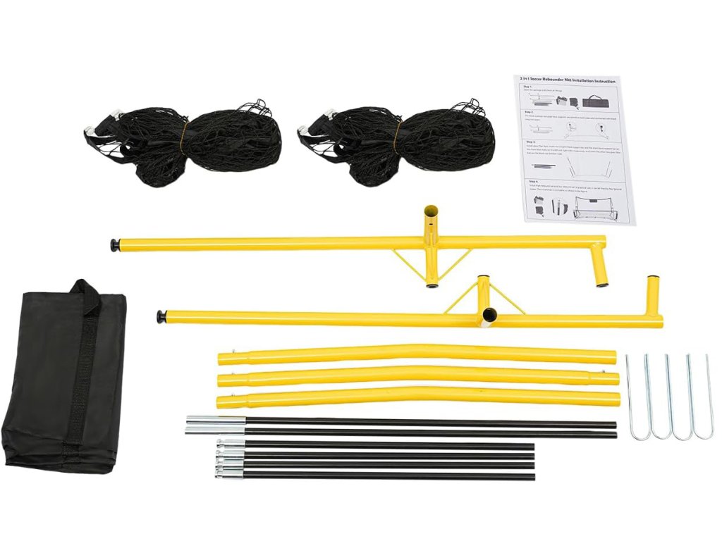 Obsah sady: Kovové profily, materiál s fotbalovou sítí, upevňovací kolíky, montážní návod, taška pro snadné skladování nebo přepravu