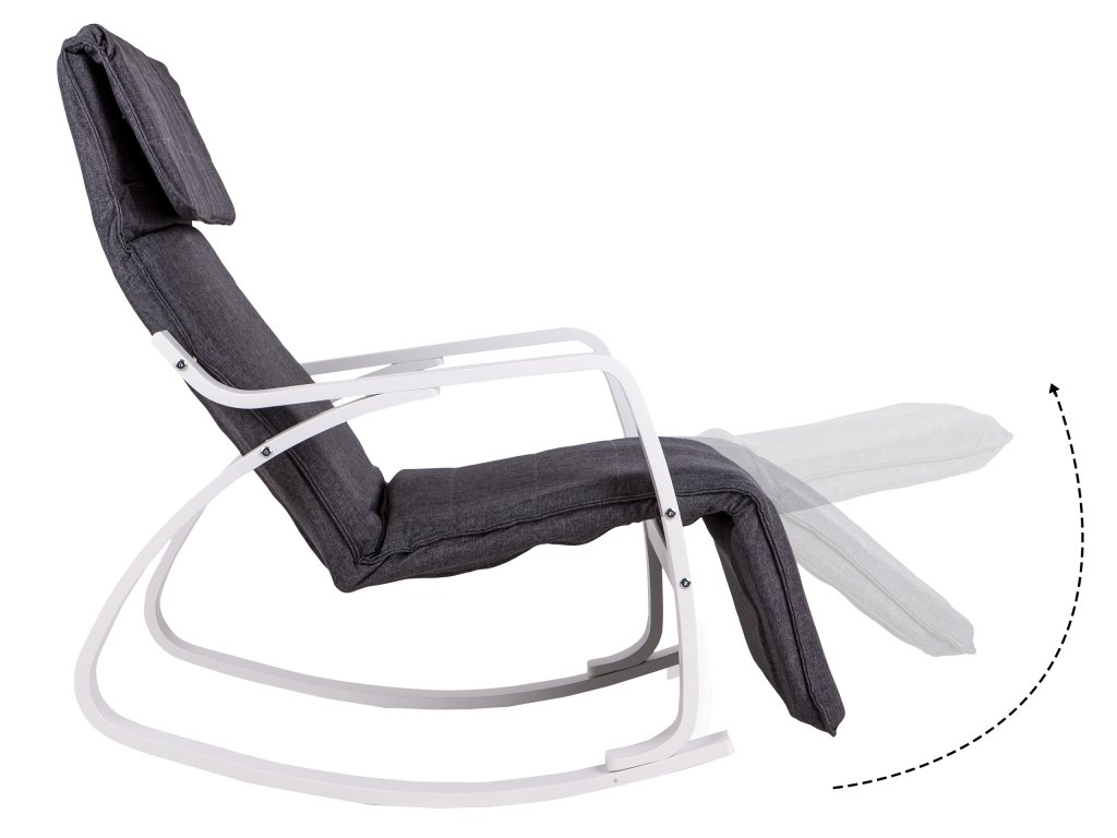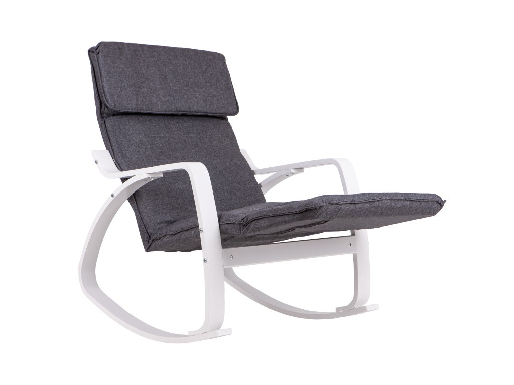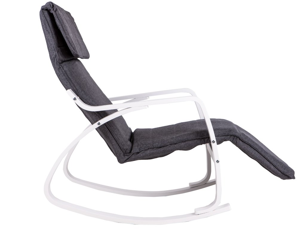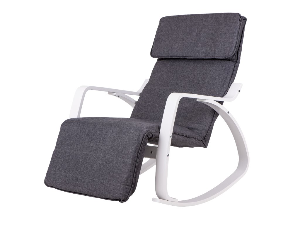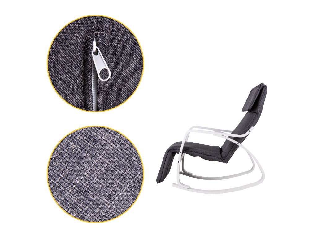 Kluzáky houpacího křesla jsou vyrobeny z profilované hnědé překližky, která má velmi vysokou pevnost. Rám sedáku a podnožky je vyroben z pevné oceli. Bavlněný potah v šedé barvě a měkká opěrka hlavy jsou odnímatelné, aby se daly vyprat. Opěrka nohou má 5 stupňů nastavení úhlu sklonu.