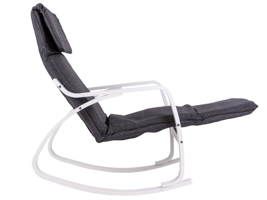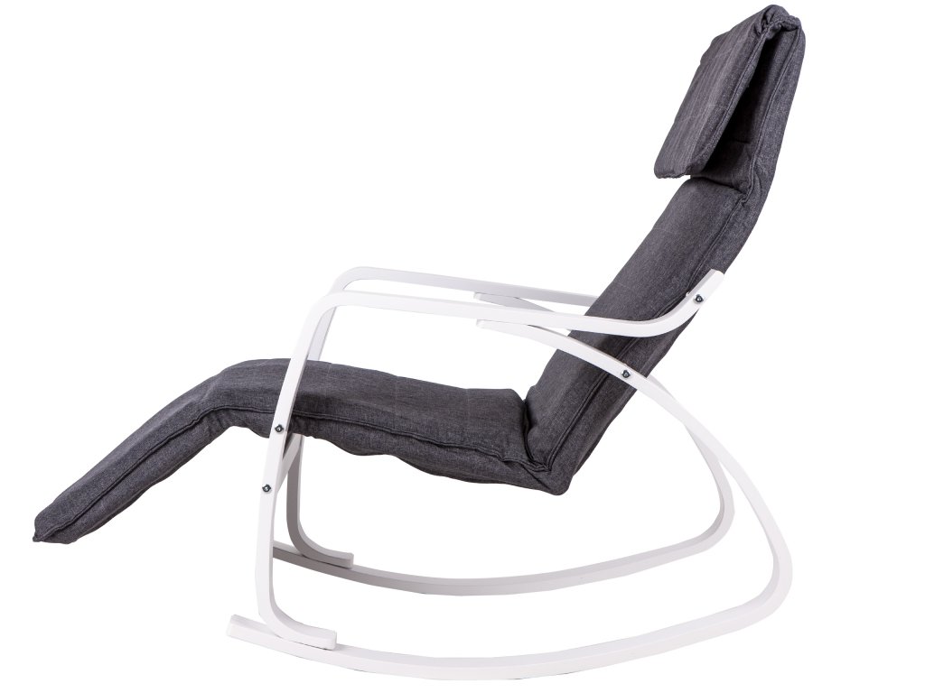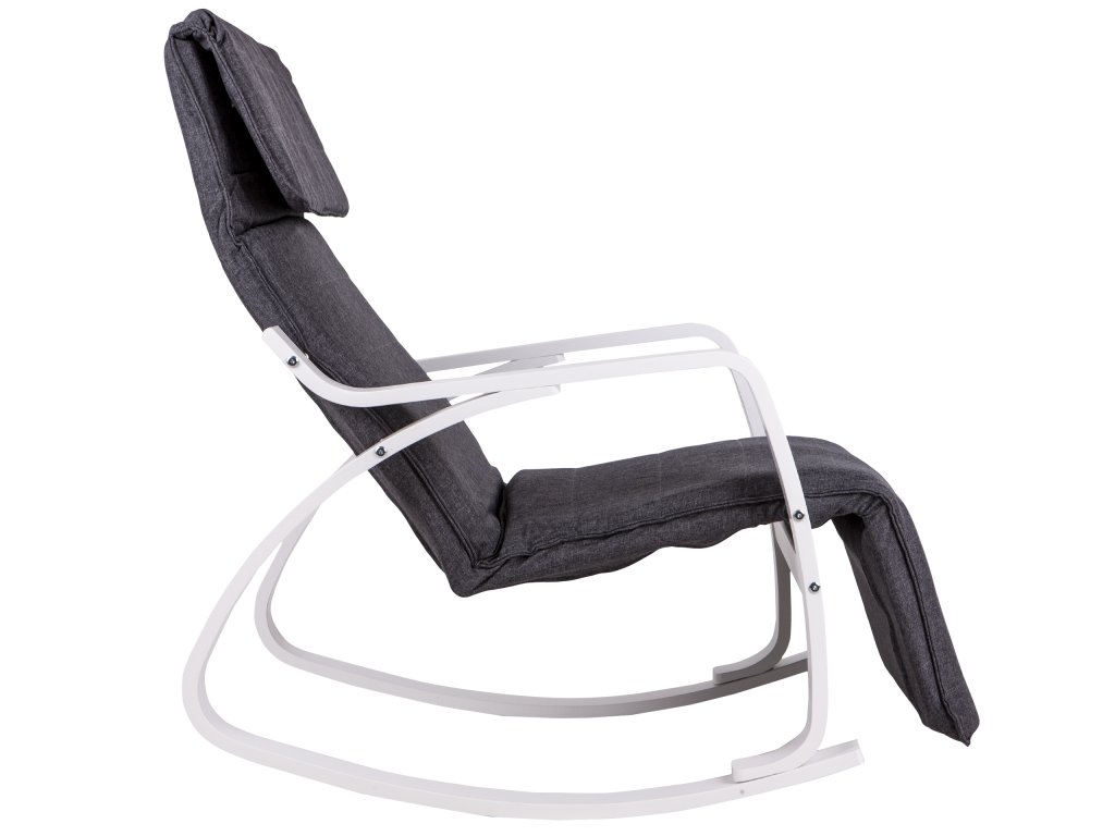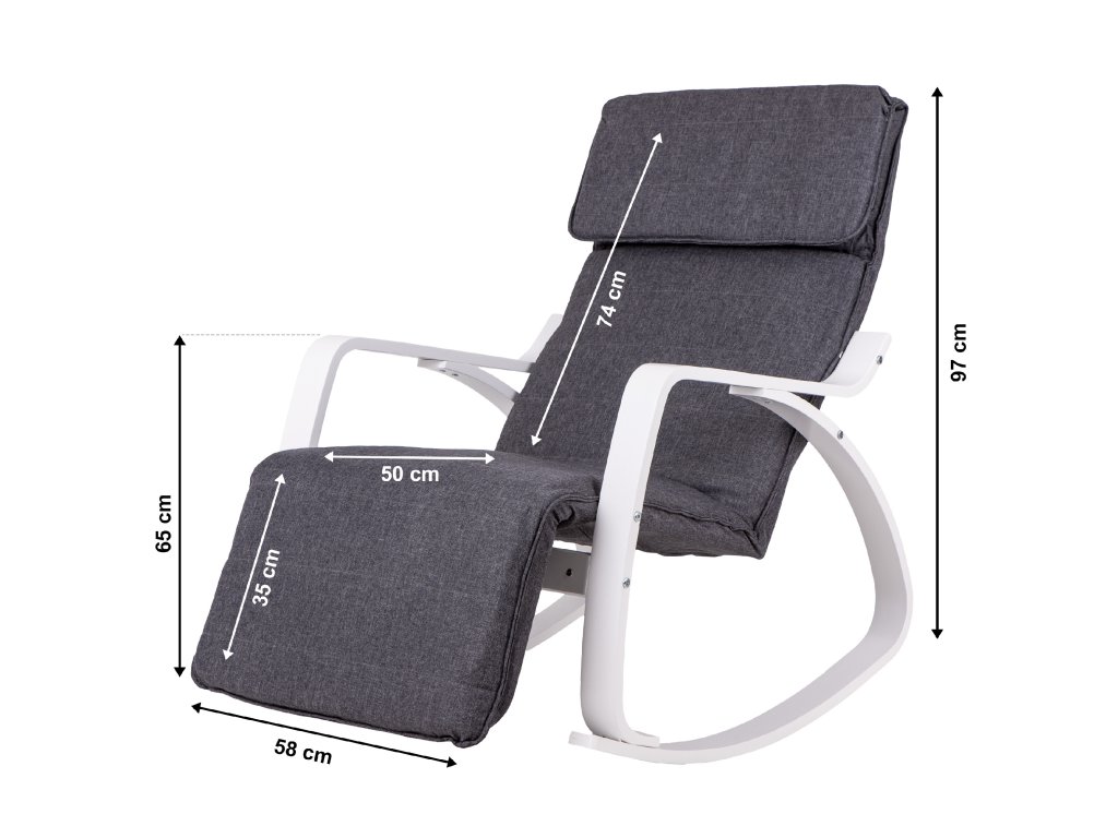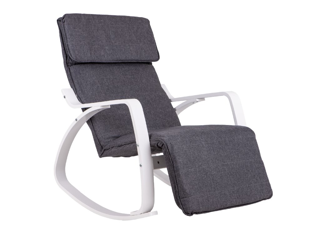 Kluzáky houpacího křesla jsou vyrobeny z profilované hnědé překližky, která má velmi vysokou pevnost. Rám sedáku a podnožky je vyroben z pevné oceli. Bavlněný potah v šedé barvě a měkká opěrka hlavy jsou odnímatelné, aby se daly vyprat. Opěrka nohou má 5 stupňů nastavení úhlu sklonu.