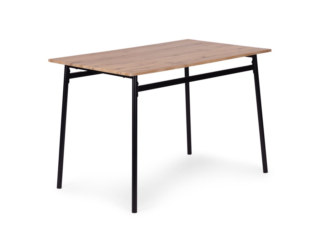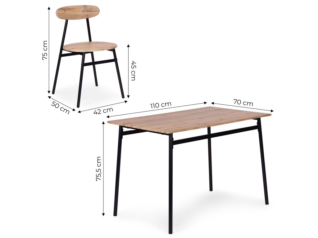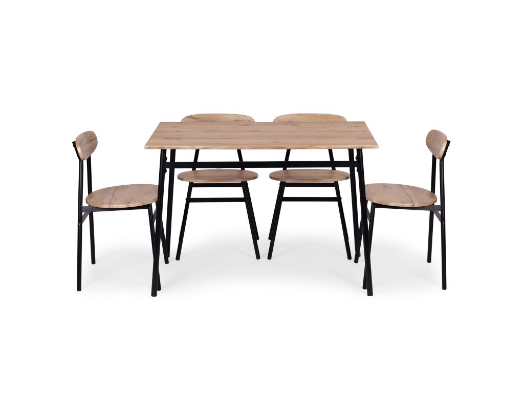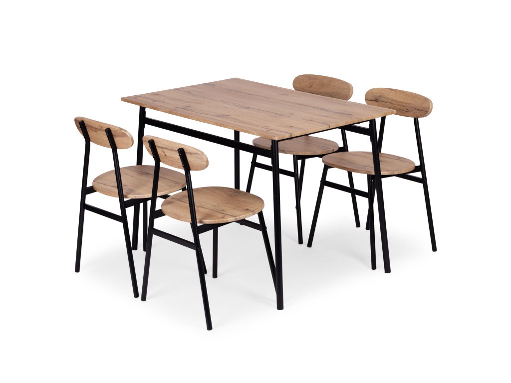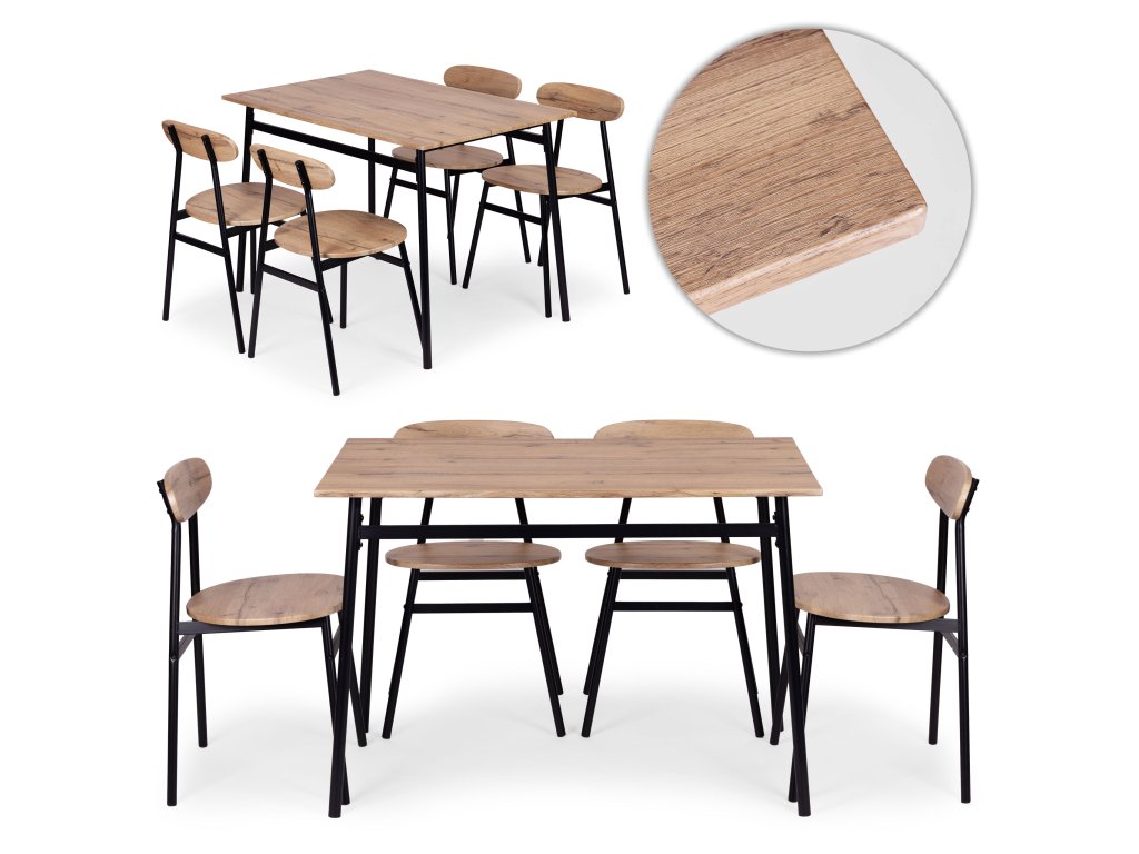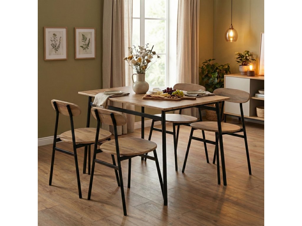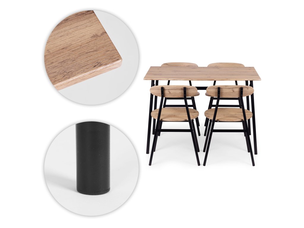 Funkční sada nábytku ve stylu loft je ideálním řešením pro moderní interiéry – od kuchyně a jídelny až po stylový obývací pokoj. Deska stolu, sedáky a opěradla židlí jsou vyrobeny z MDF desky potažené odolnou dýhou, což usnadňuje údržbu a zajišťuje odolnost při každodenním používání.