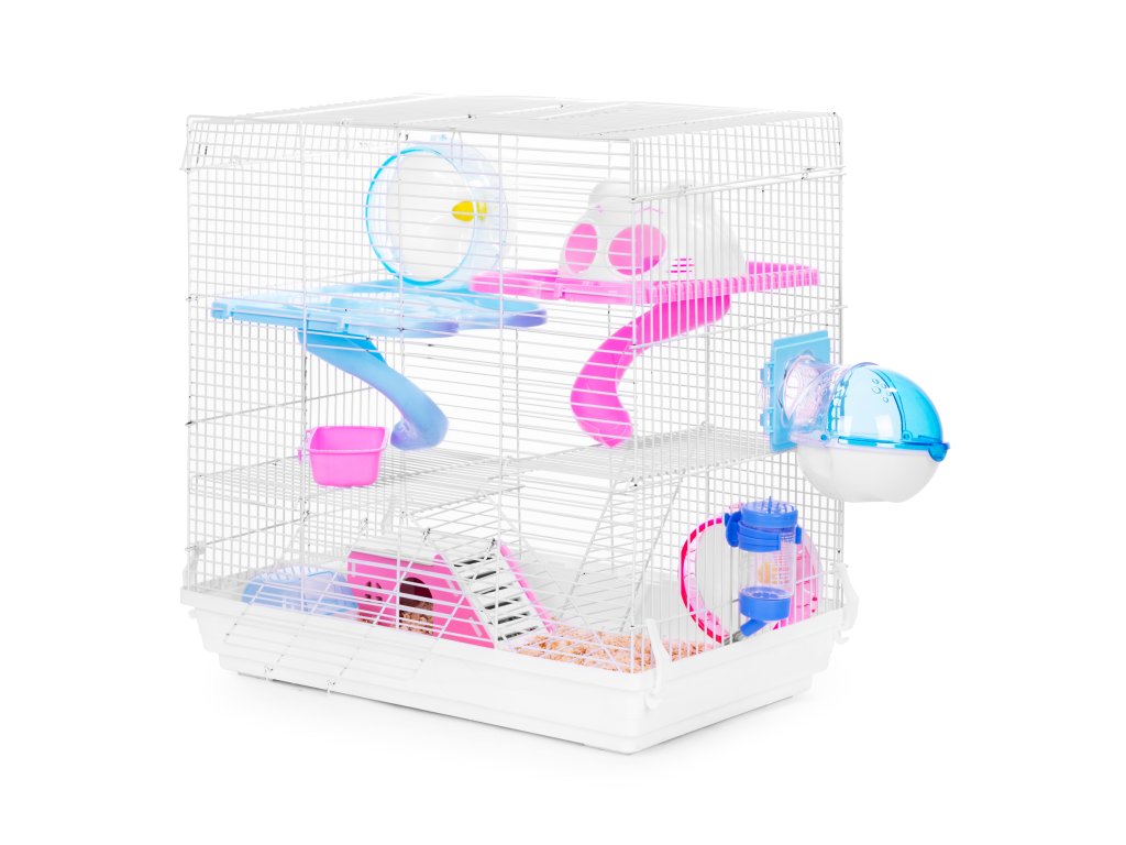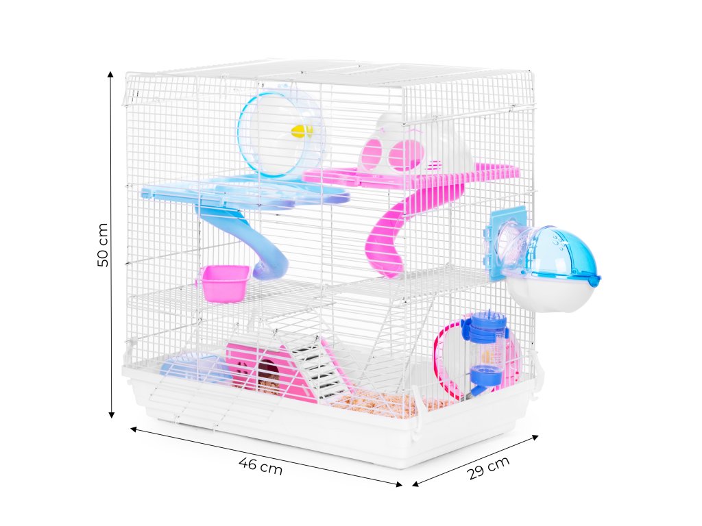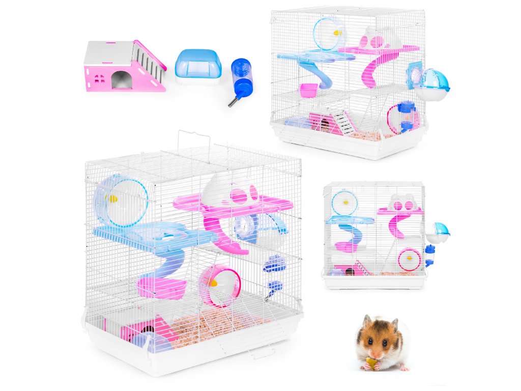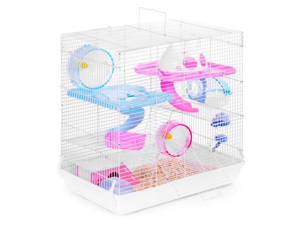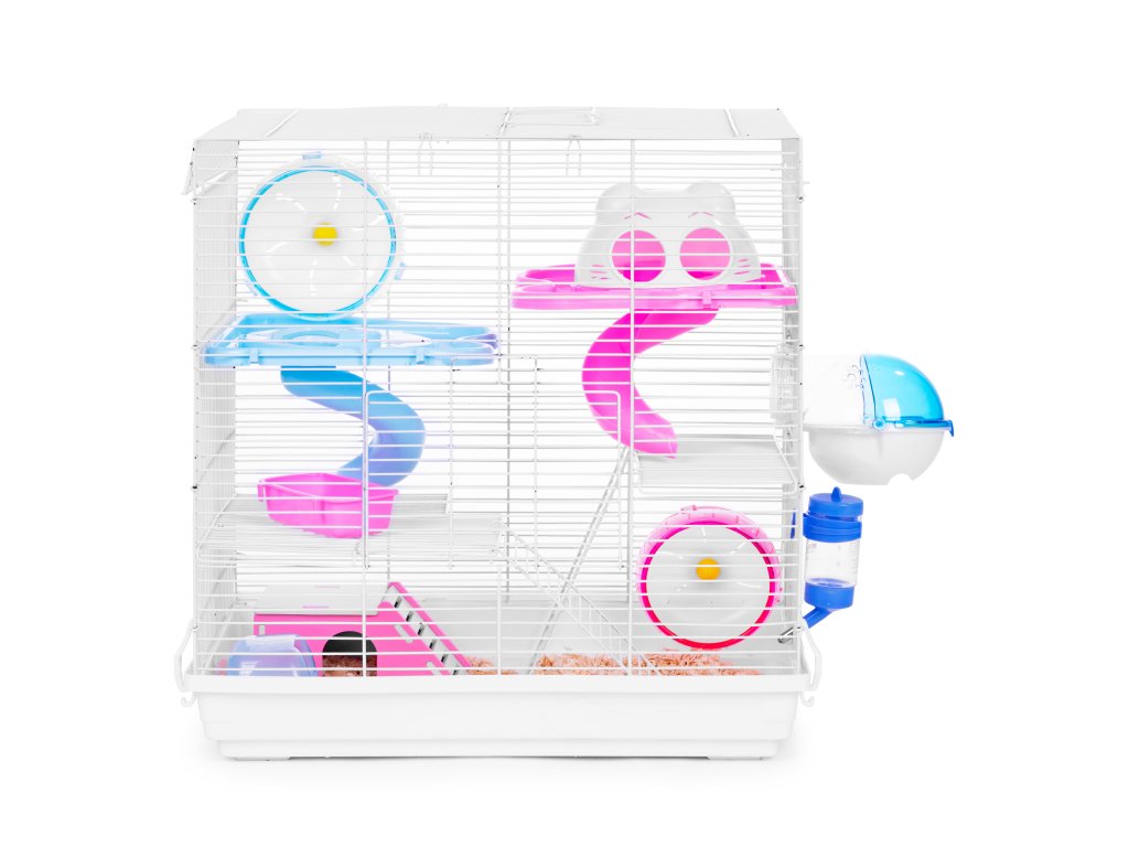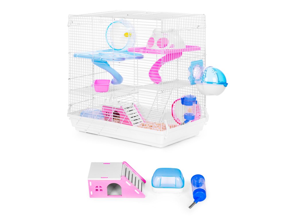 - Obsahuje: dvě skluzavky, domek, běžecké kolečko, čtyři patra, misku na krmení, láhev na vodu