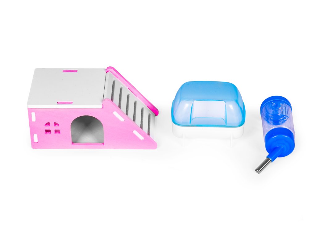 Obsah sady: | domeček, skluzavky, láhev na vodu, cvičební kolečko, čtyři úrovně, misku na krmení |