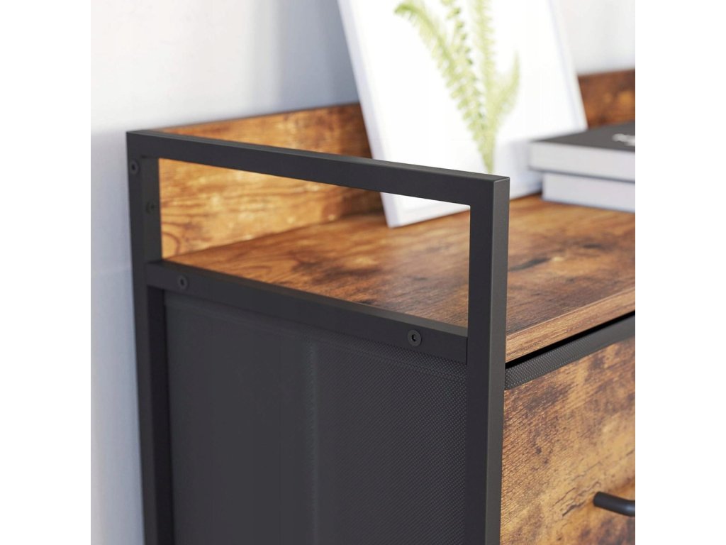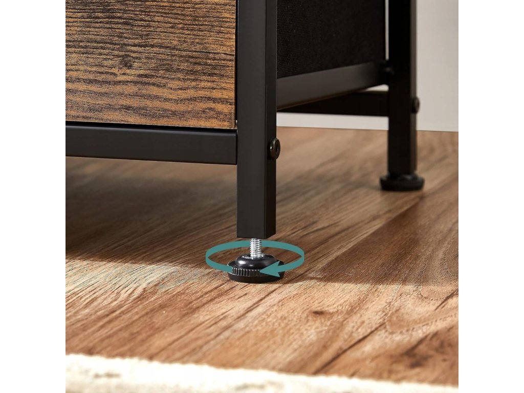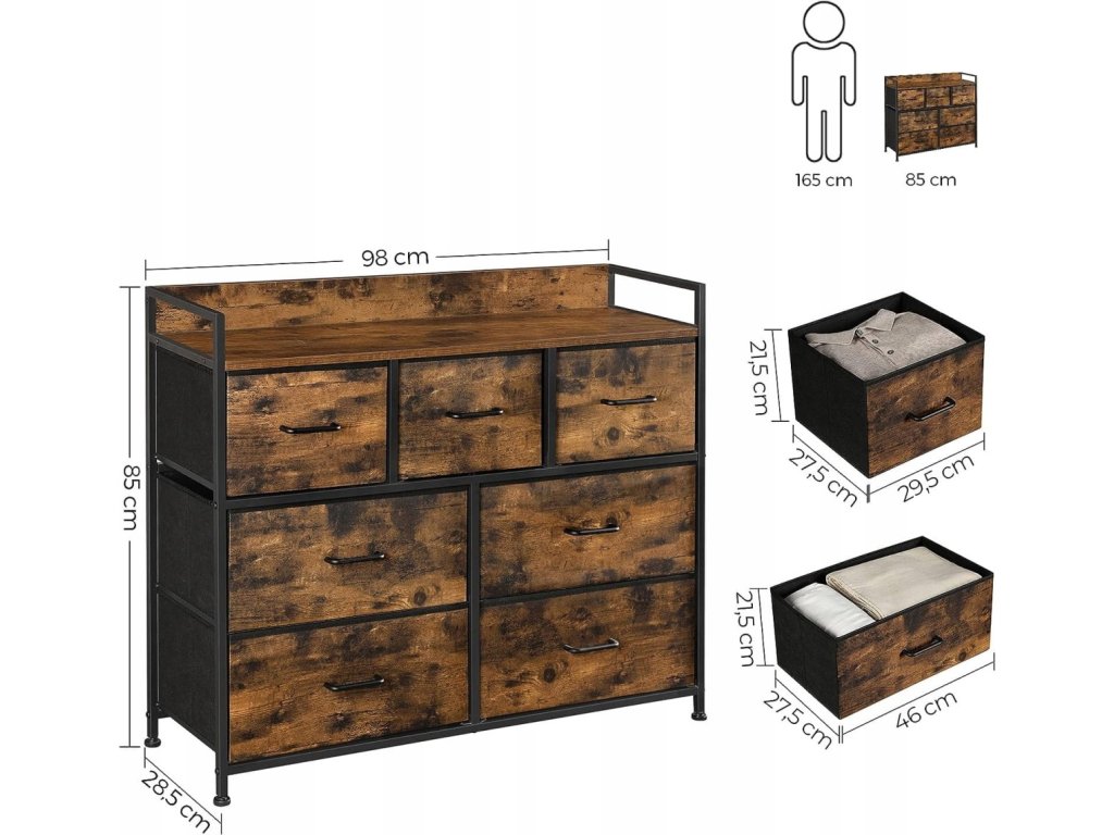 Stylová komoda má sedm prostorných zásuvek, které umožňují uspořádat vše – od prádla přes ručníky až po dokumenty. Konstrukce založená na kovovém rámu zaručuje stabilitu a odolnost, a použití materiálů jako MDF, oxfordská tkanina a netkaná textilie zajišťuje trvanlivost a pohodlí při používání.