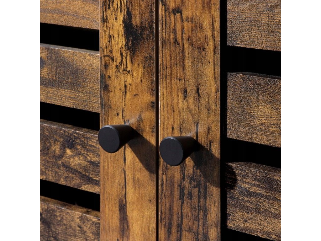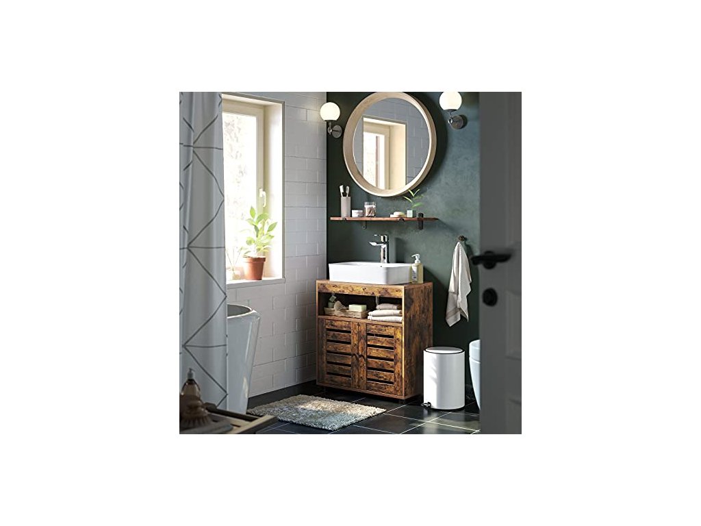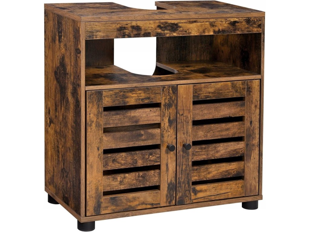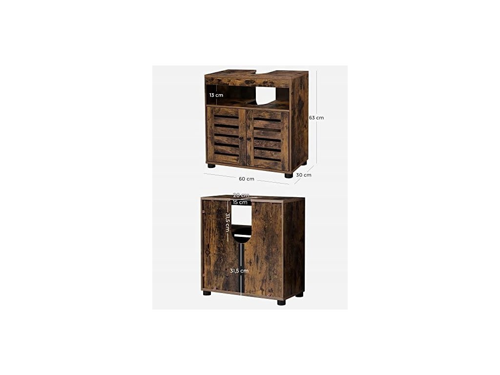 Vytvořte si v koupelně estetický a funkční prostor s touto rustikální skříňkou pod umyvadlo. Její kompaktní, ale prostorný design pomáhá uspořádat ručníky, kosmetiku a hygienické potřeby a zároveň zachovává elegantní vzhled. Je vyrobena z odolné dřevotřískové desky v trendovém rustikálním hnědém provedení, které dodá každé místnosti teplo a charakter.
