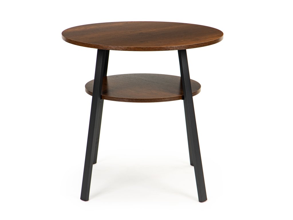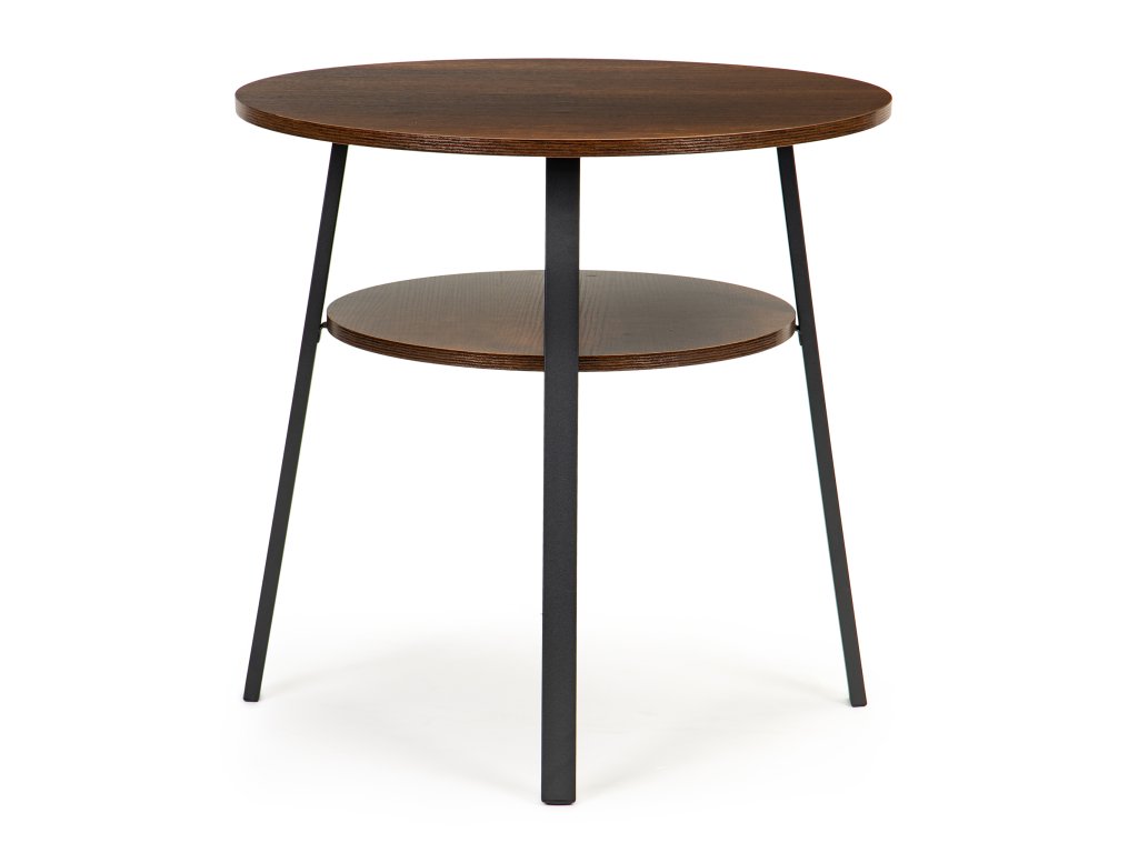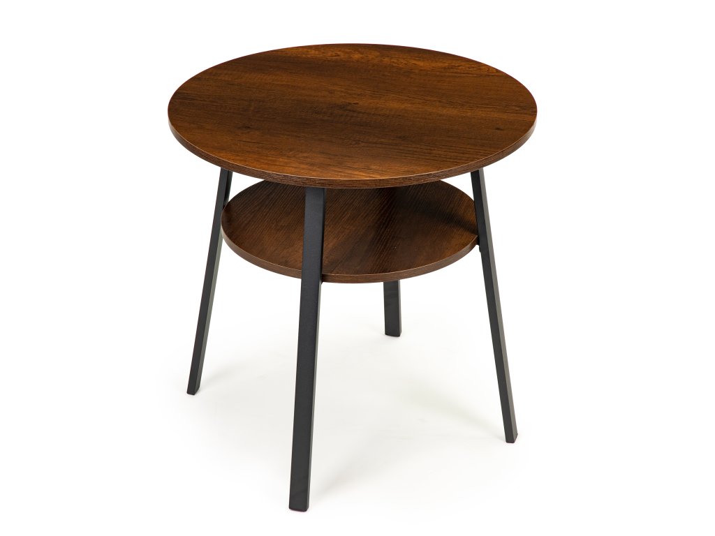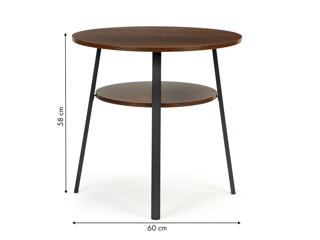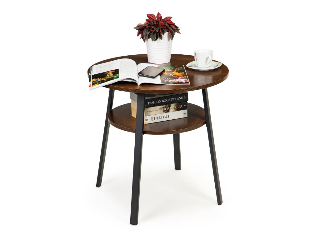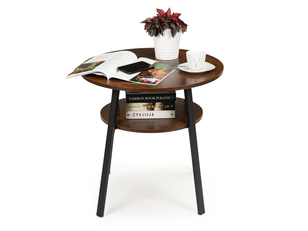 Konstrukce stolu je založena na pevném kovovém rámu s práškovým lakováním v matné černé barvě, který zajišťuje odolnost proti poškrábání a dlouhou životnost. Deska stolu je vyrobena z laminované dřevěné desky v barvě přírodního dřeva, což mu dodává teplý, domácký charakter, a další police pod deskou umožňuje pohodlné ukládání drobností – od ovladačů přes knihy až po šálek čaje.