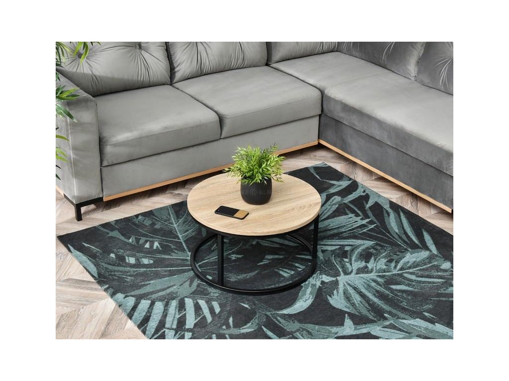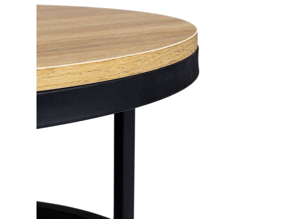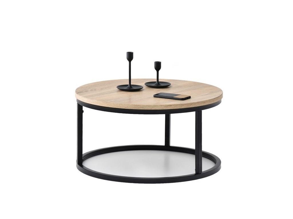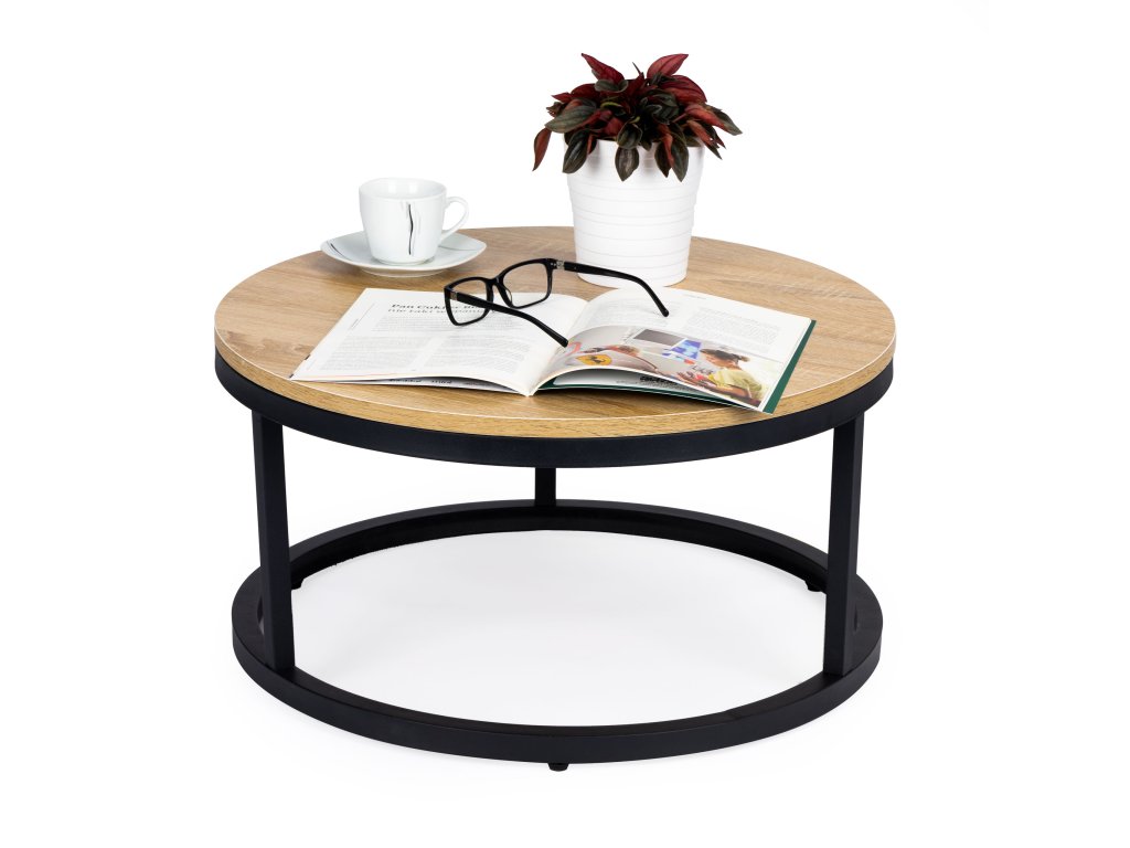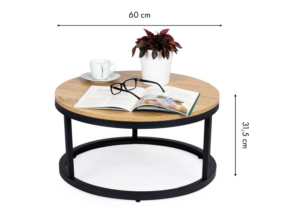 Konferenční stolek o průměru 60 cm je ideální volbou do obývacího pokoje nebo ložnice, protože v sobě spojuje styl a funkčnost. Je vyroben z dřevotřískové desky potažené odolným laminátem a podepřený práškově lakovaným kovovým rámem, který zaručuje stabilitu a odolnost.