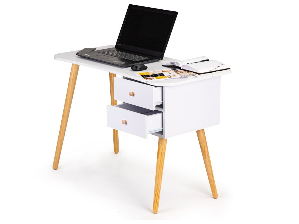 Funkční psací stůl se vyznačuje stabilní konstrukcí a moderním skandinávským stylem. Nohy z borového dřeva jsou upevněny v kovových úchytcích, což zajišťuje nejen odolnost, ale i zajímavý vizuální efekt. Bílá deska s jemně profilovaným čelem zaručuje pohodlí při práci, studiu nebo péči o krásu. Psací stůl se skvěle hodí do domácí kanceláře, pokoje pro mládež, pracovny nebo jako toaletní stolek do ložnice.