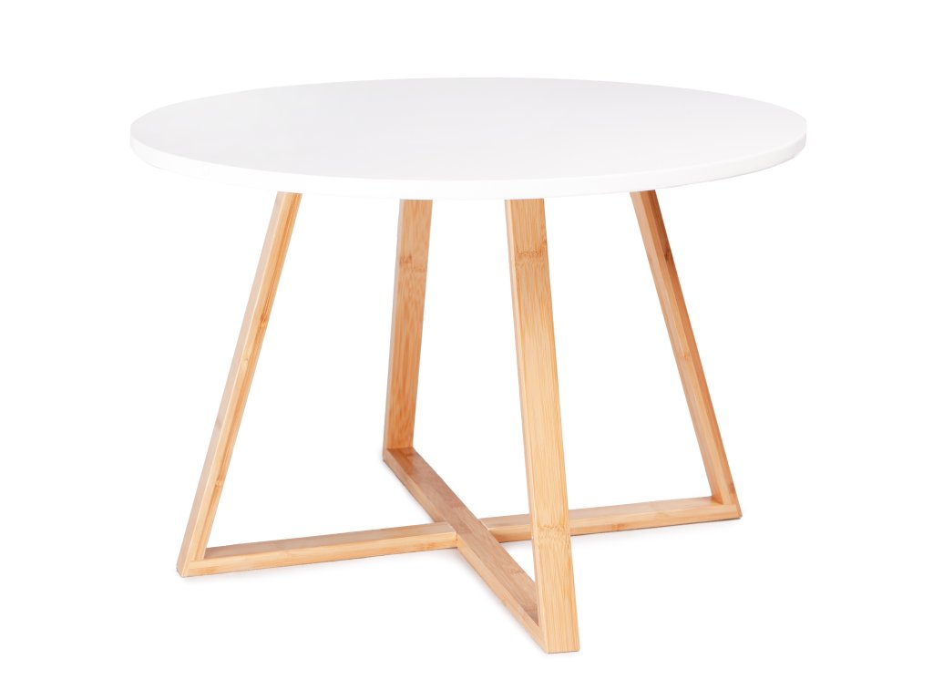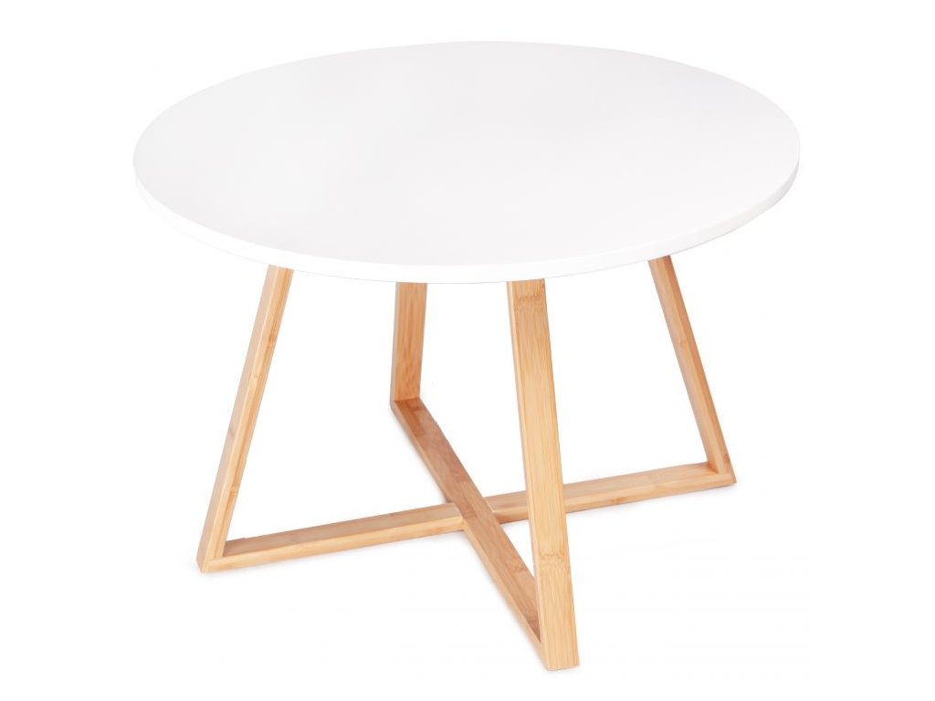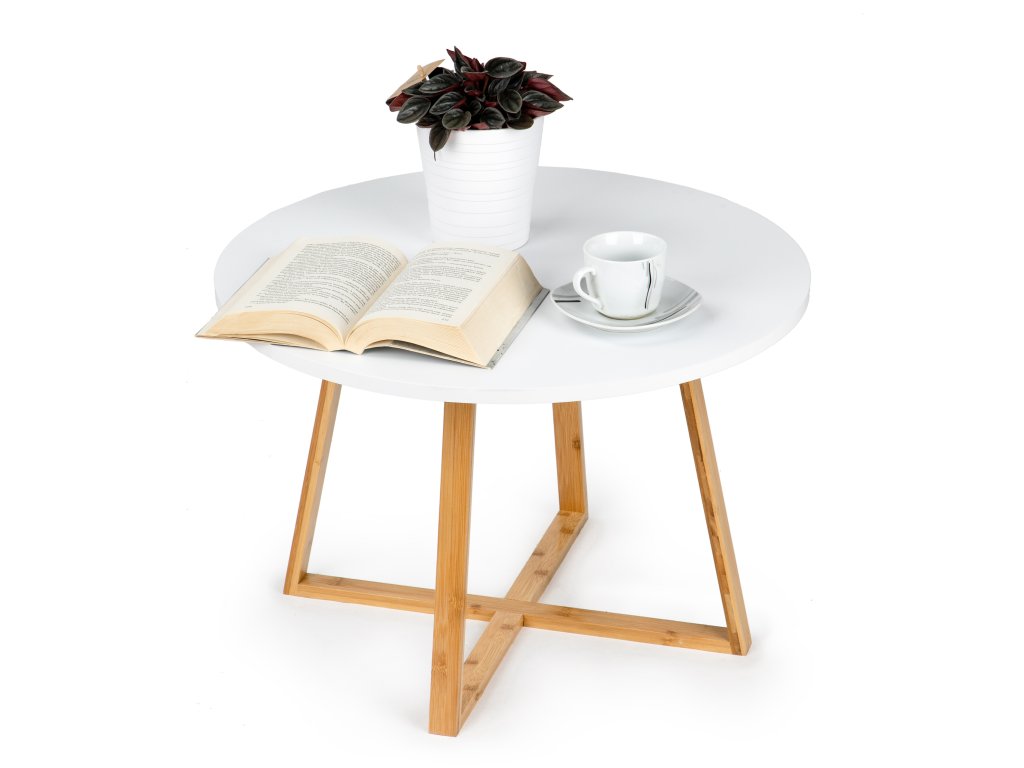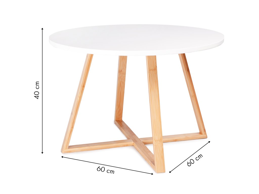 Stůl se ideálně hodí do moderních, minimalistických interiérů. Je vhodný do obývacího pokoje, ložnice i do kavárny. Deska je vyrobena z lakované MDF desky, díky čemuž je odolná proti poškrábání při běžném používání. Nohy stolku jsou vyrobeny z bambusového dřeva, které tvoří charakteristický „kříž“. Díky tomu je stůl velmi stabilní. Produkt je určen k samostatné montáži (cca 20 min.).