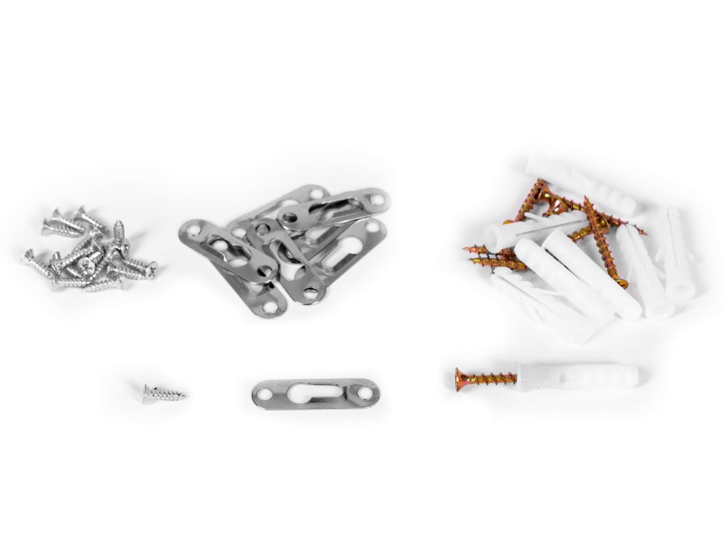 Sada obsahuje speciální kovové úhelníky a šrouby, kterými můžete poličku připevnit ke zdi.