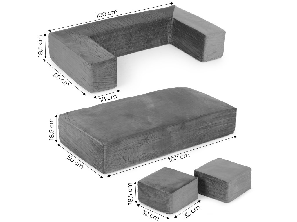 Modulární pohovka značky ECOTOYS se skládá ze 4 polštářů, které lze libovolně skládat – od klasické pohovky přes lehátko až po uzavřený koutek na hraní. Je to perfektní řešení do dětských pokojů a heren, které nabízí pohodlné místo k odpočinku a kreativní činnosti. Každý polštář je vyplněn měkkou a pružnou pěnou, která se přizpůsobí tělu dítěte a zajistí maximální pohodlí.