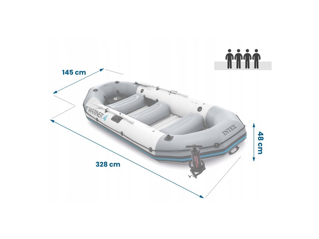 Nafukovací člun Mariner 4 je čtyřmístný ponton o rozměrech 328 x 145 x 48 cm, vyrobený z třívrstvého PVC o tloušťce 0,75 mm. Má 3 vzduchové komory zajišťující bezpečnost a bostonské ventily. Je vybaven 2 hliníkovými pádly, ruční pumpou, 3 nafukovacími sedadly, držáky na rybářské pruty, taškou a možností montáže motoru. Nafukovací člun má také zajišťovací lano, které vede kolem celé konstrukce. Maximální nosnost je 500 kg.