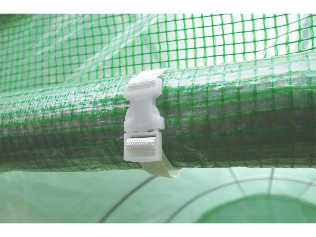 Fólie může být pevně připevněna k fóliovníku pomocí suchých zipů, což zajišťuje správné napnutí a ochranu plodin před deštěm a větrem.