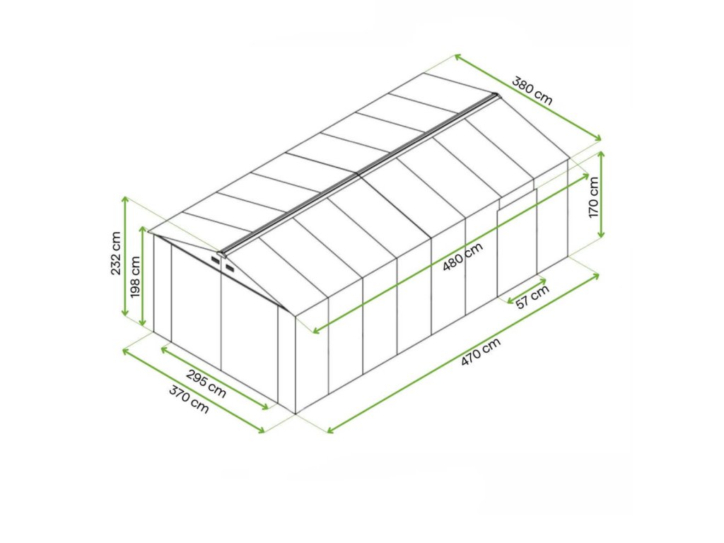 Garáž Kingston 380x480 cm všestranné využití, jako garáž, dílna, sklad atd. Její robustní konstrukce a promyšlený design zajišťují bezpečné skladování vozidel a zařízení a chrání je před vnějšími vlivy. To lidem poskytuje klid s vědomím, že jejich majetek je řádně zabezpečen 24 hodin denně, 7 dní v týdnu.
