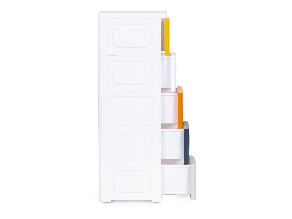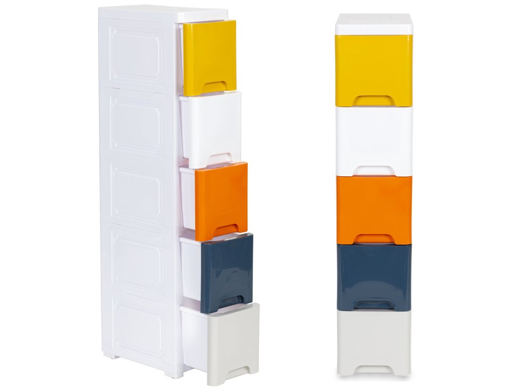 Lehký, stabilní a odolný, a co je nejdůležitější, ideální pro skladování nejrůznějších předmětů. Osvědčí se jako funkční organizér v koupelně a v dětském pokoji nebo herně poslouží jako místo pro uložení hraček, knih a dalších pokladů. Regál se skládá z pěti barevných zásuvek se speciálně tvarovaným úchytem na přední straně, který usnadňuje jejich zasouvání a vysouvání.
