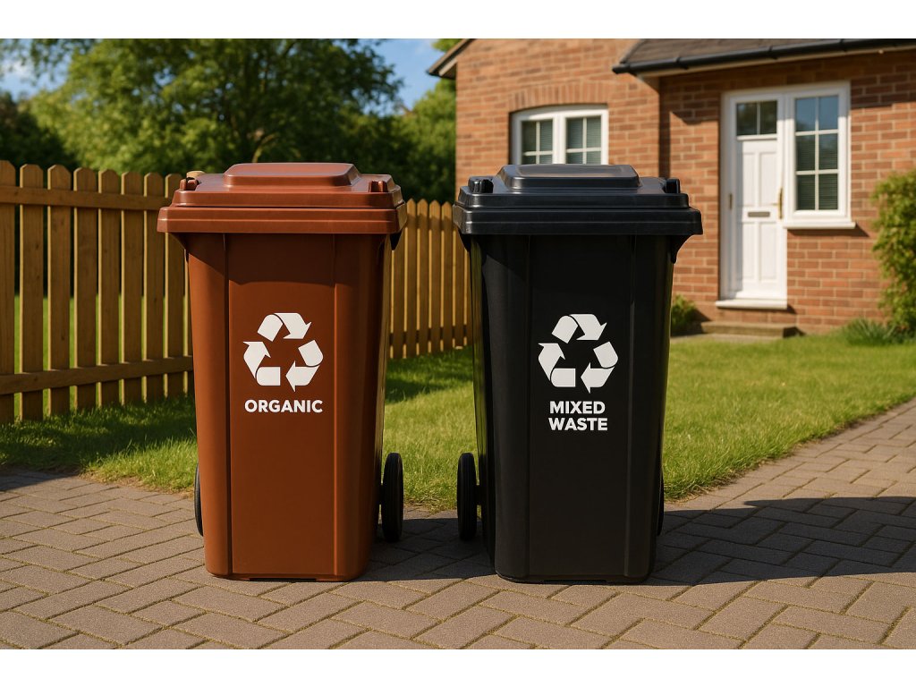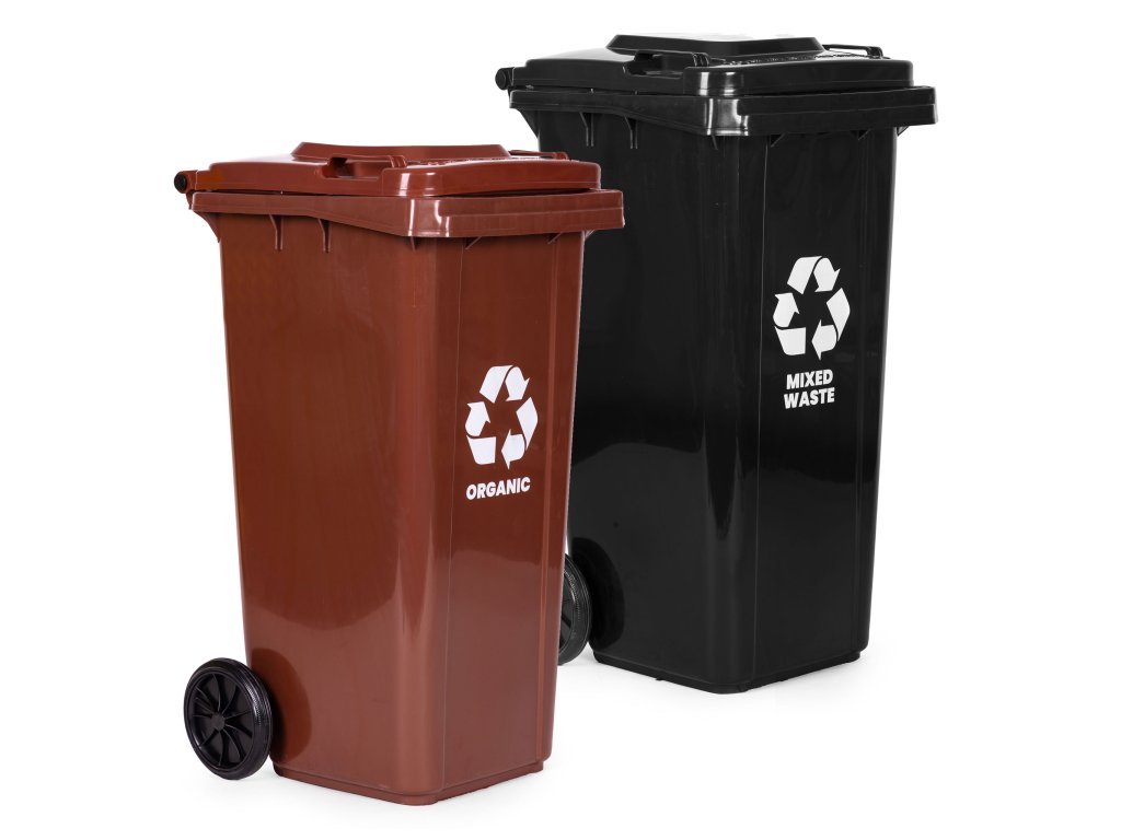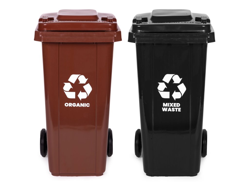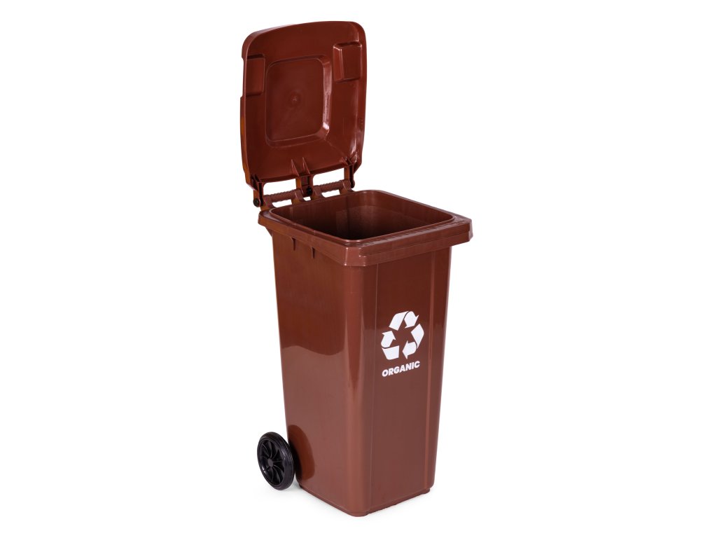 - Hnědá popelnice: biologický odpad (rostlinné zbytky jídla, slupky, kávová a čajová sedlina, větve, listí).