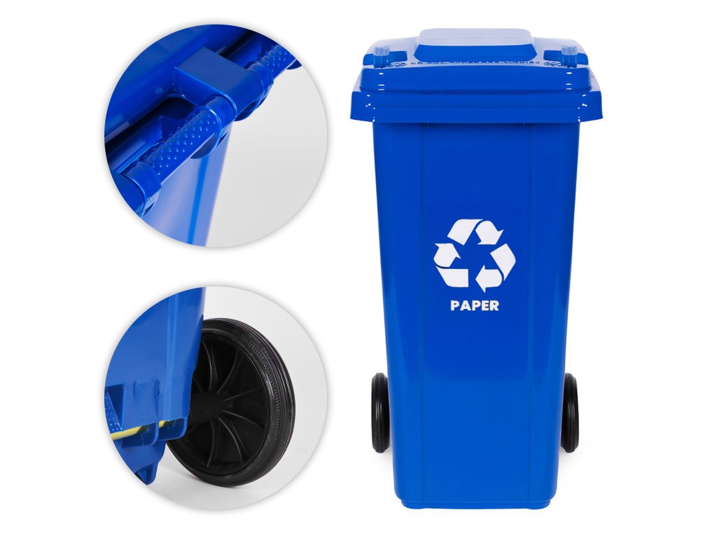 - Modrá popelnice: papír (noviny, sešity, lepenka, kartony, katalogy).