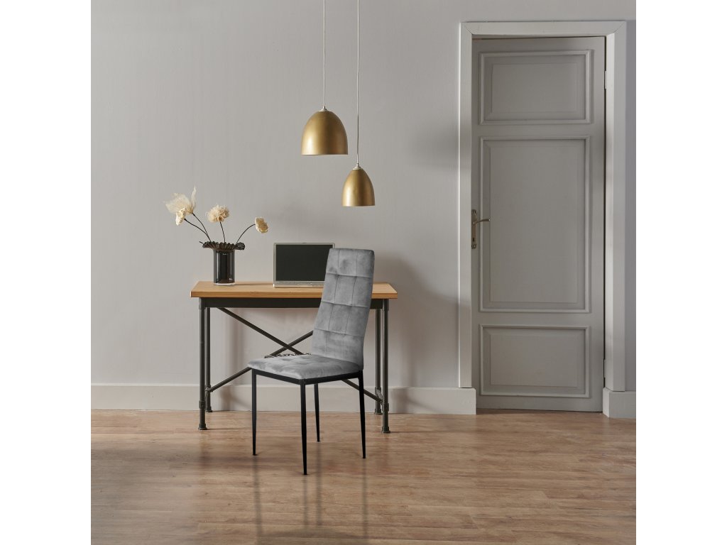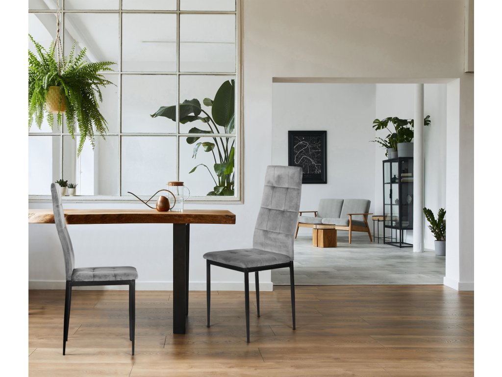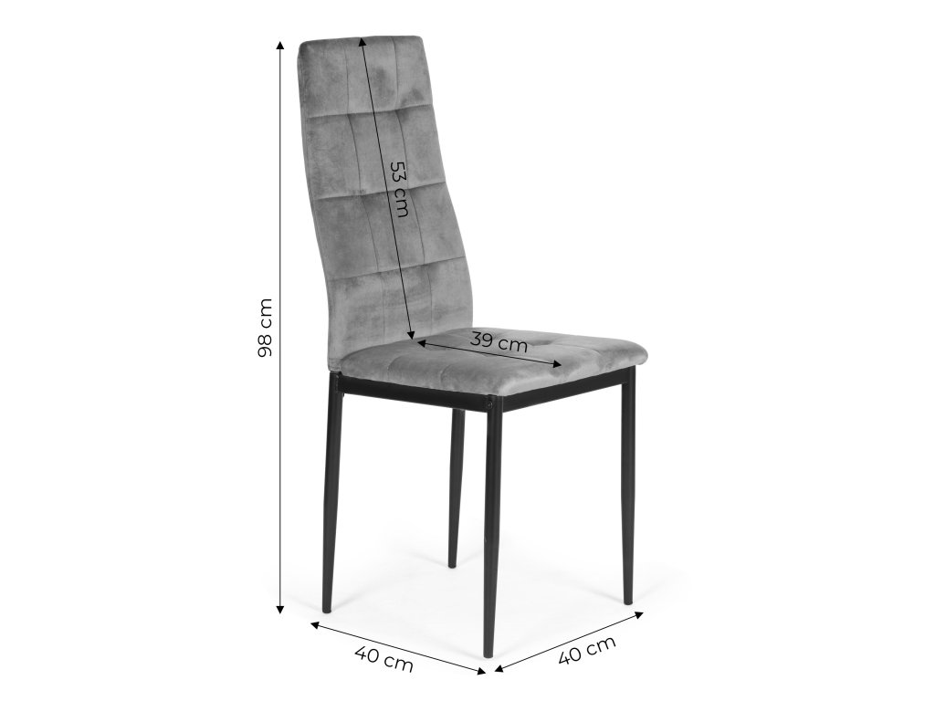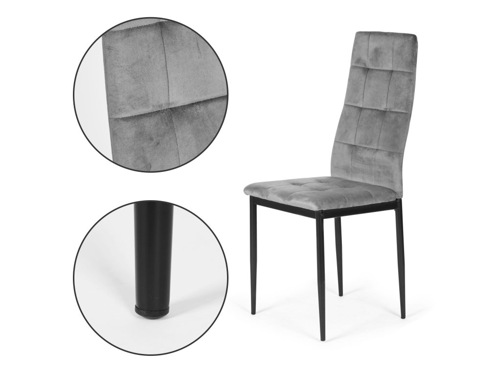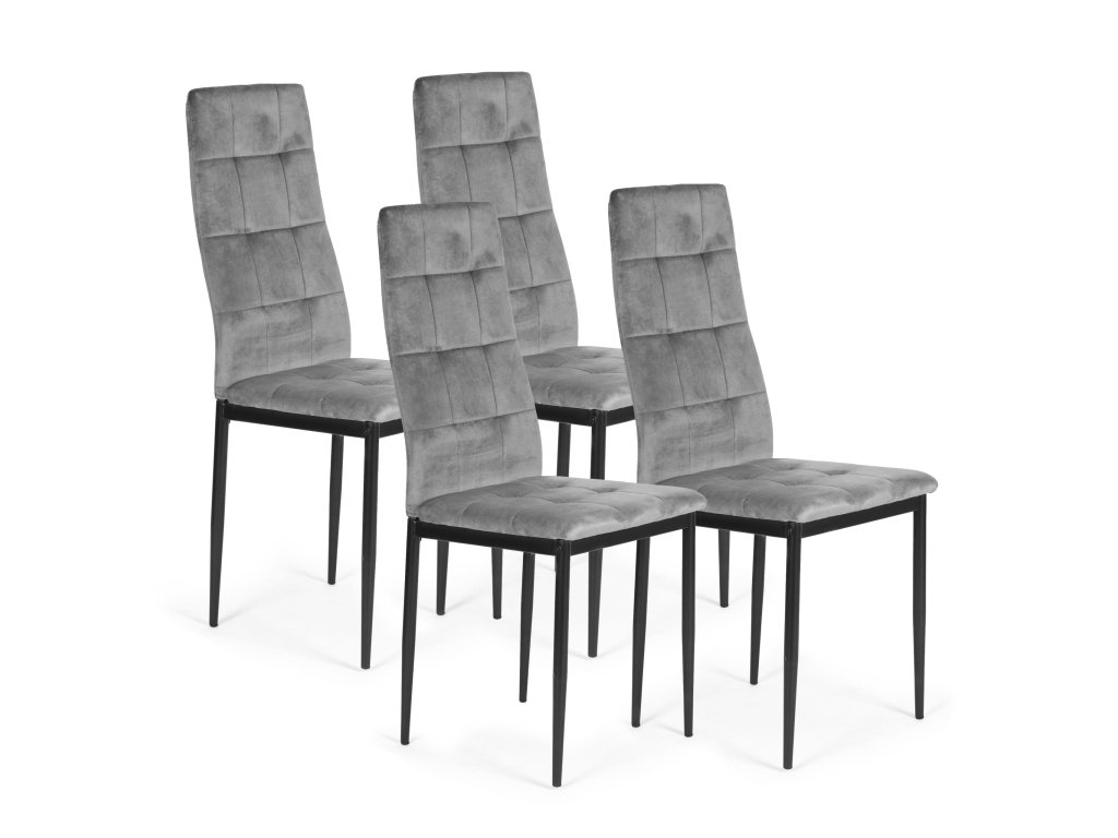 Sada čtyř židlí z veluru je ideální volbou do jídelny nebo obývacího pokoje. Židle se vyznačují elegantním, moderním designem a vysokým opěradlem z příjemné látky. Mají prošívané provedení a černé, práškově lakované ocelové nohy. Jsou pohodlné a stabilní, s nosností až 120 kg.