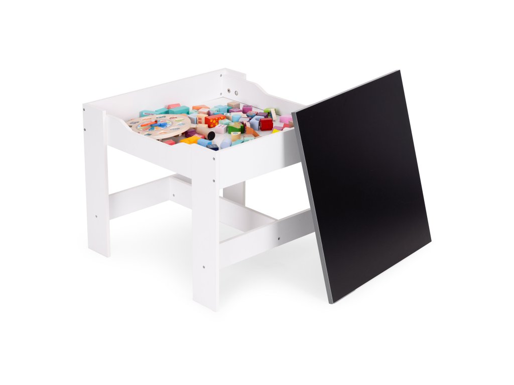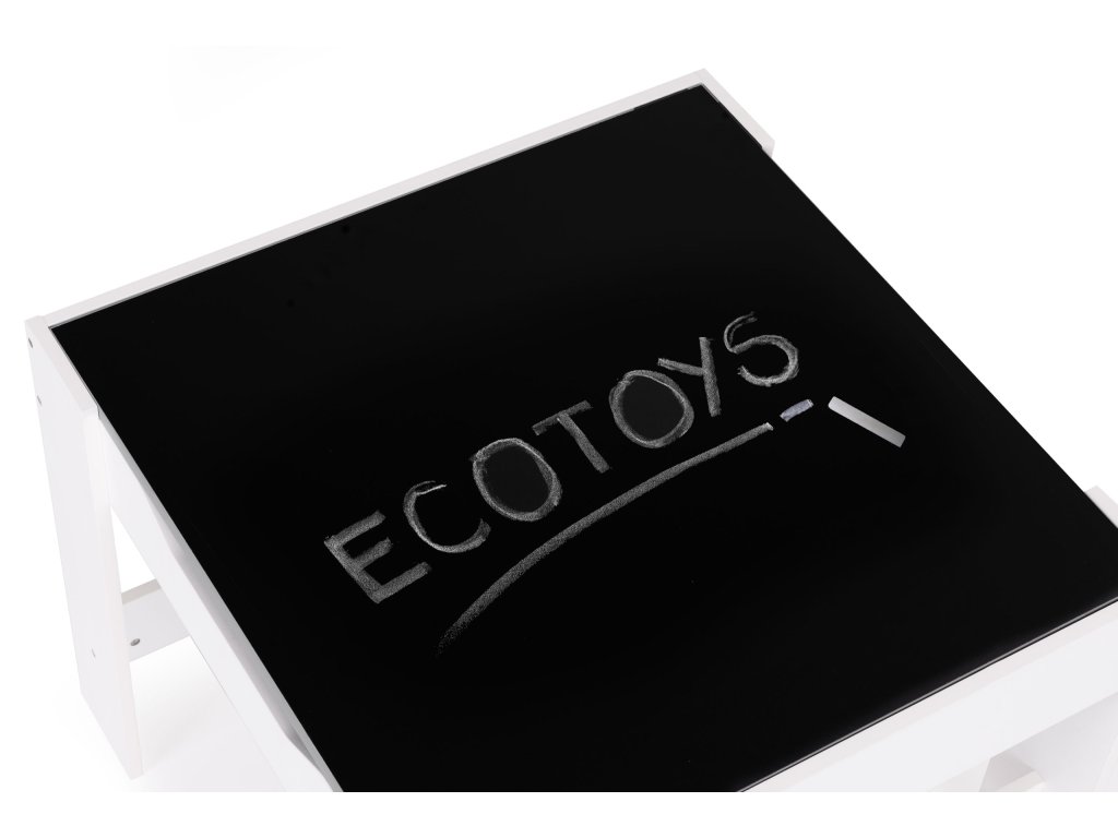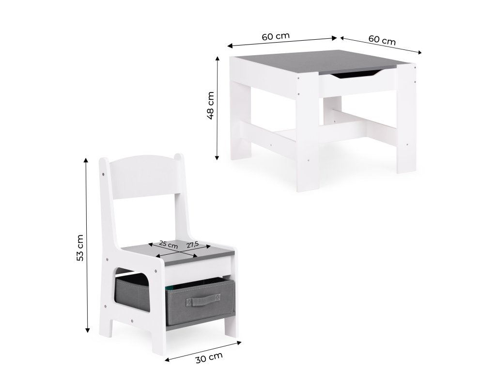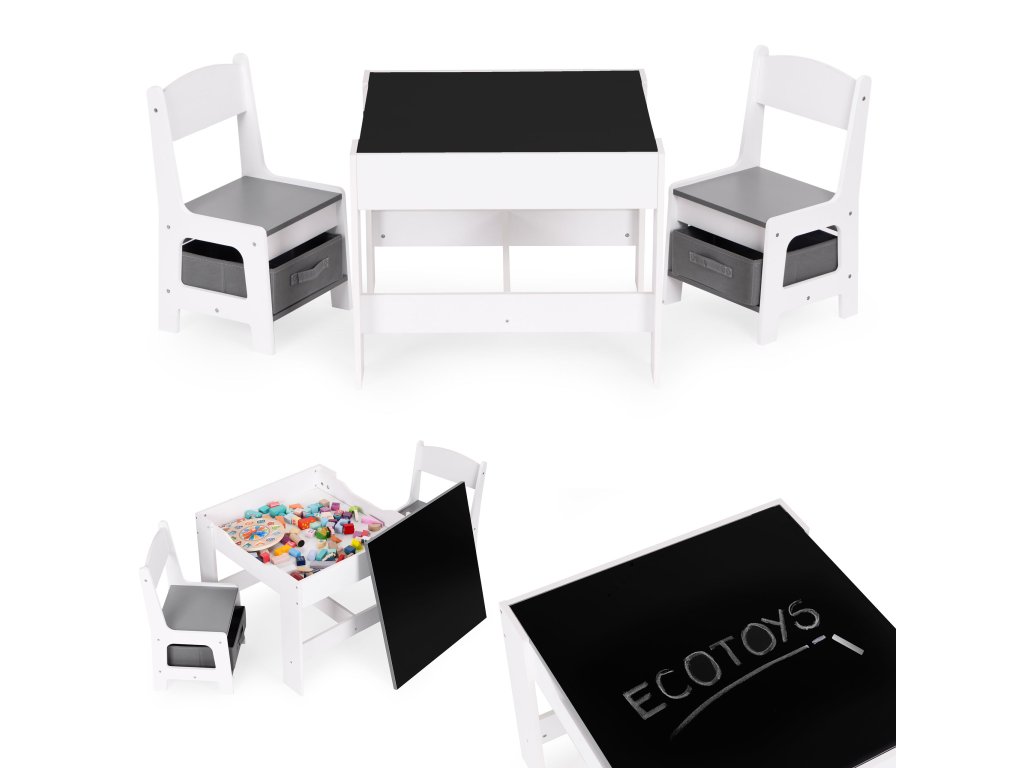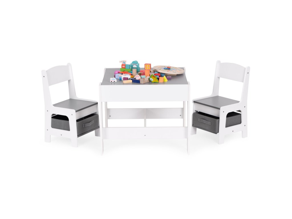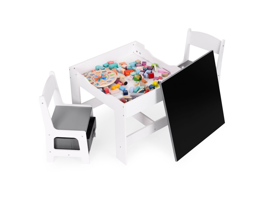 Sada obsahuje 2 židle a stolek. Sada má odolnou a stabilní konstrukci z MDF desky. Stůl je vybaven oboustrannou, odnímatelnou deskou s křídovou tabulí. Pod deskou se nachází funkční prostor pro uložení kostek, hraček nebo jiných drobností.