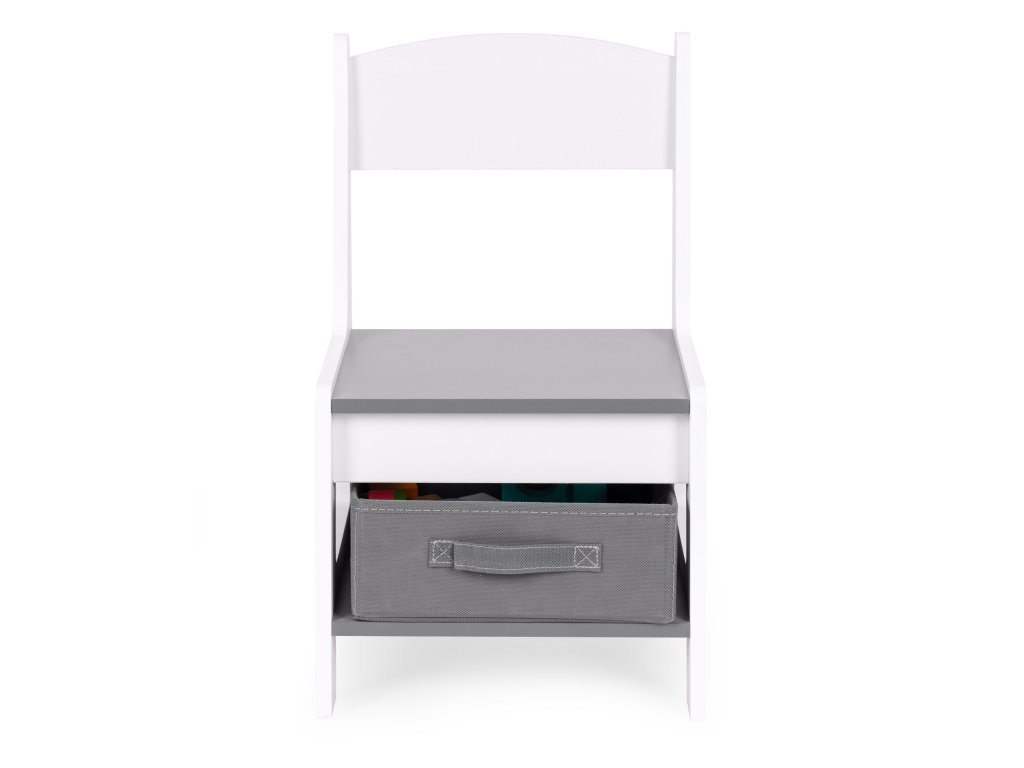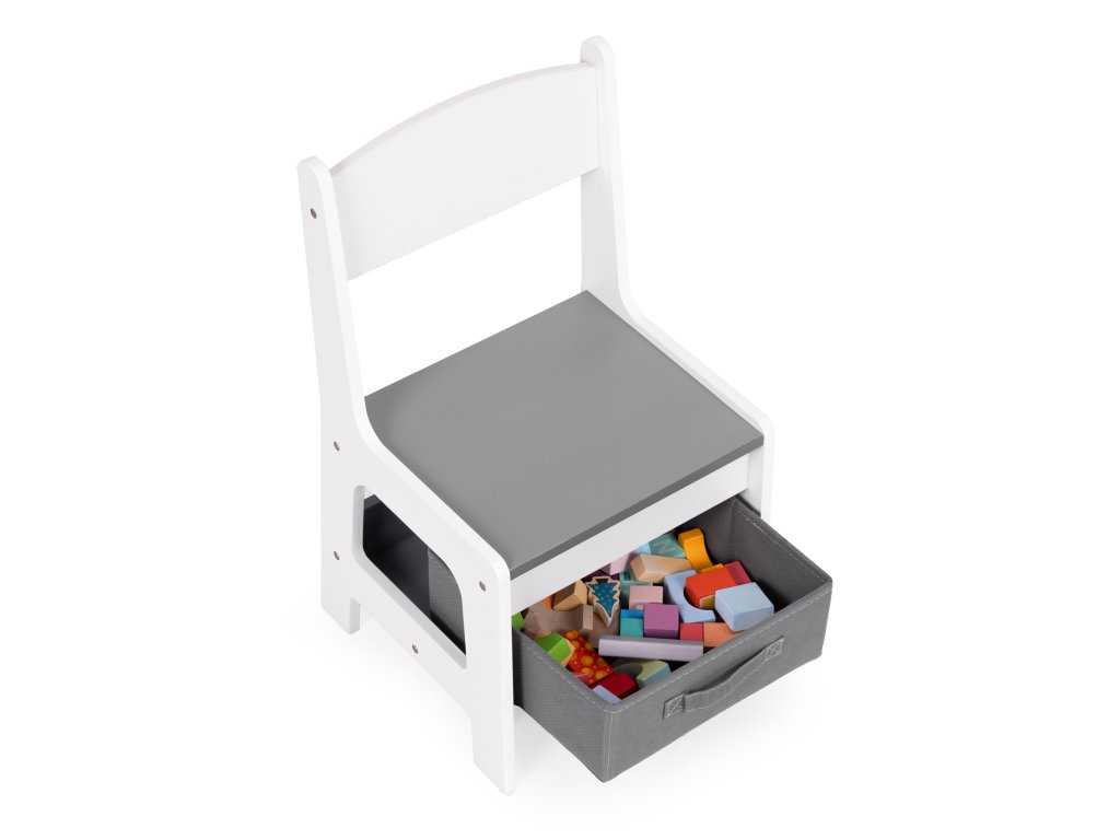 Každá židle je vybavena praktickou látkovou zásuvkou umístěnou přímo pod sedákem. Všechny důležité předměty jsou tak vždy po ruce, což dětem pomáhá samostatně si organizovat svůj prostor. Měkký a bezpečný design zásuvky zajišťuje, že je pohodlná a snadno použitelná.