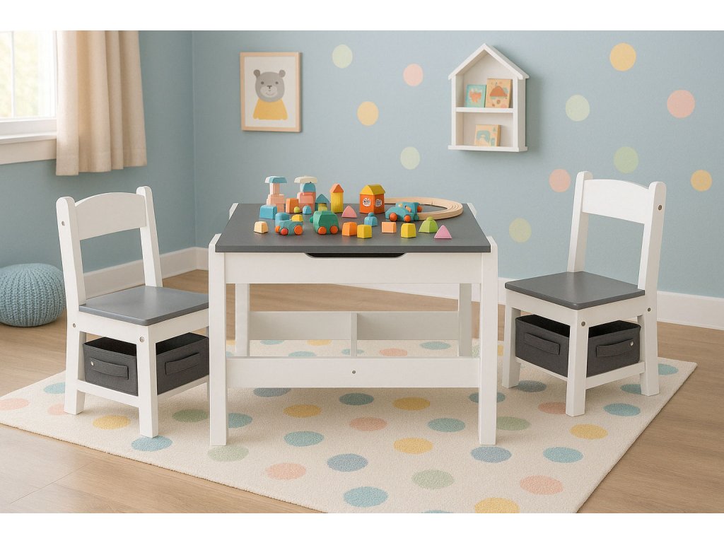 Sada dětského nábytku od ECOTOYS je skvělým řešením pro rodiče, kteří hledají praktické, bezpečné a stylové vybavení do dětského pokoje. Sada obsahuje stůl s oboustrannou deskou a dvě židle, z nichž každá je pod sedákem vybavena látkovou zásuvkou. Díky tomu mohou i ty nejmenší děti udržovat pořádek ve svém okolí a od raného věku se učit organizovanosti.
