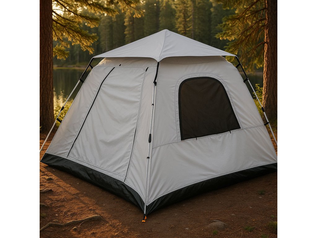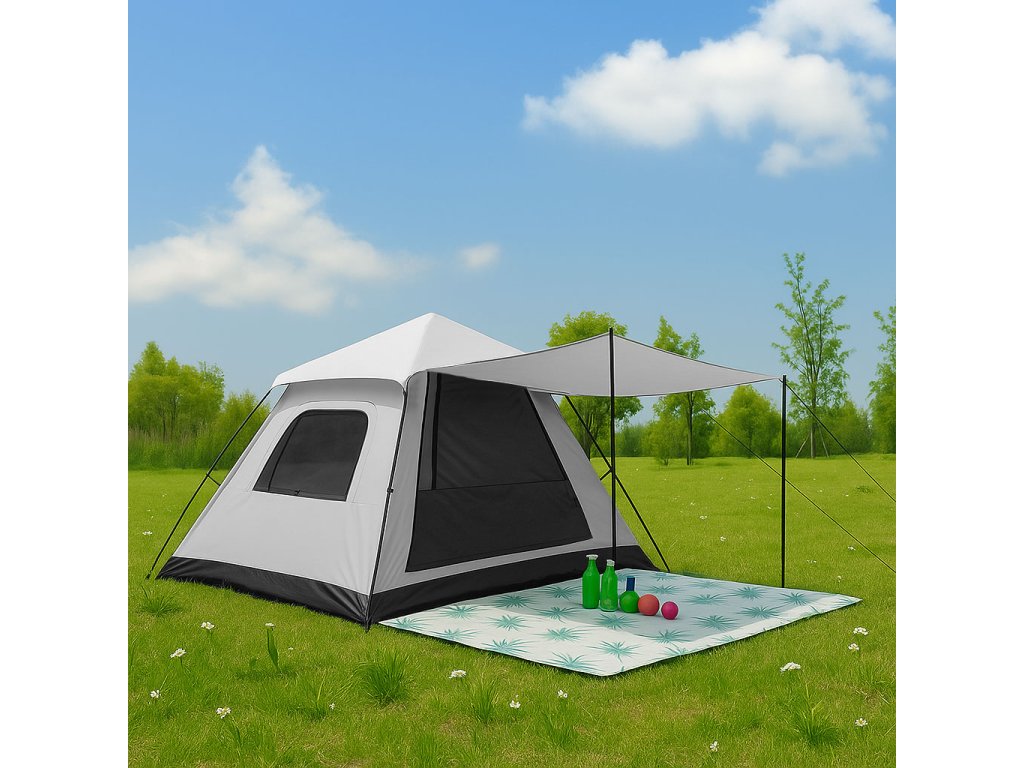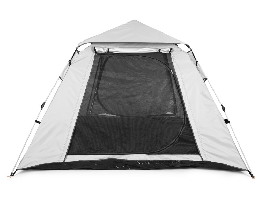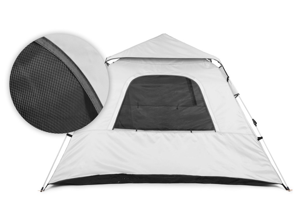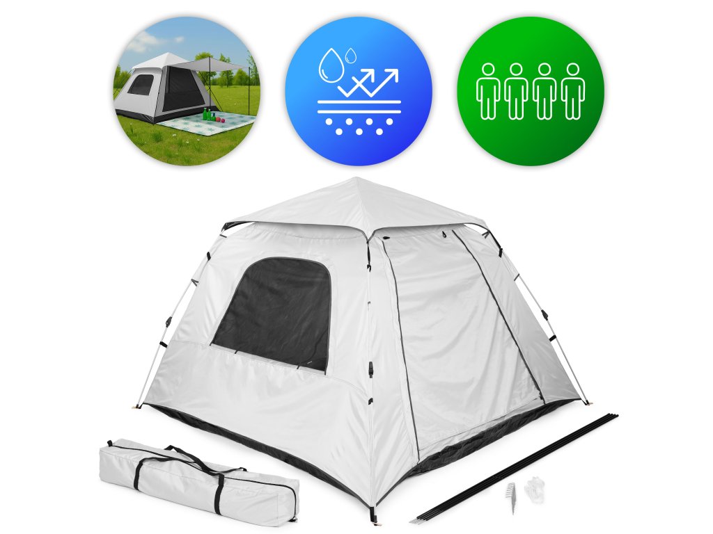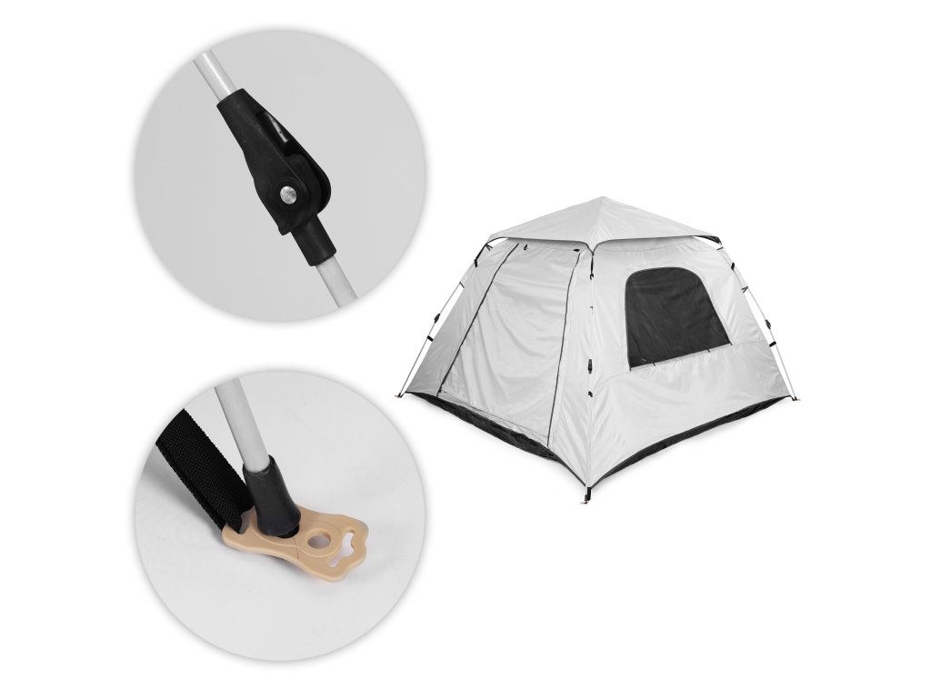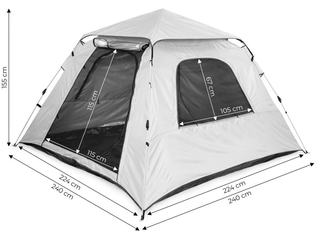 Čtyřosobový stan je ideálním řešením pro kempování, táboření a festivaly. Díky automatickému systému rozkládání se postaví během chvilky bez použití nářadí. Pevnákonstrukce ze oceli a skleněných vláken zajišťuje stabilitu a kolíky a kotvící lana chrání před větrem. Plášť z polyesteru 190T s PU povlakem je odolný proti vlhkosti a UV záření a voděodolnost 1500 mm účinně chrání před deštěm. Moskytiéry ve dveřích, oknech a stříšce zajišťují větrání a ochranu před hmyzem.