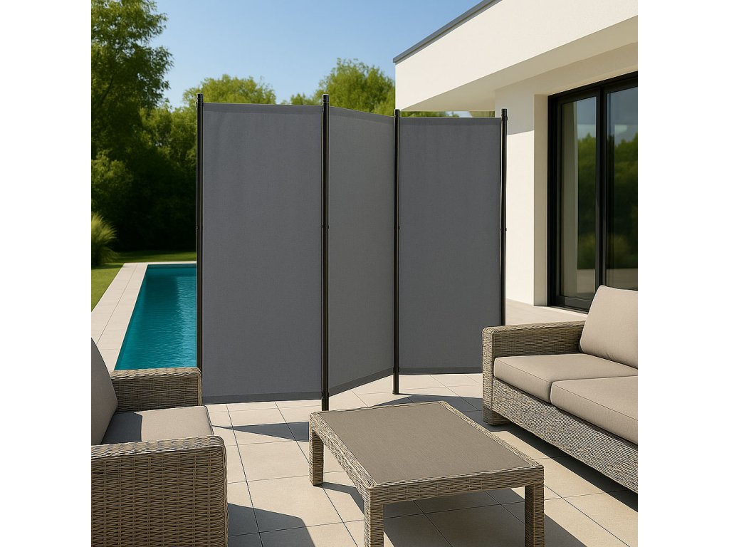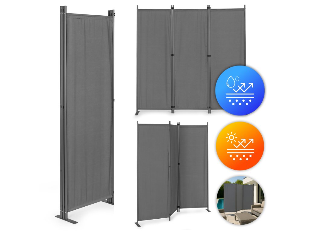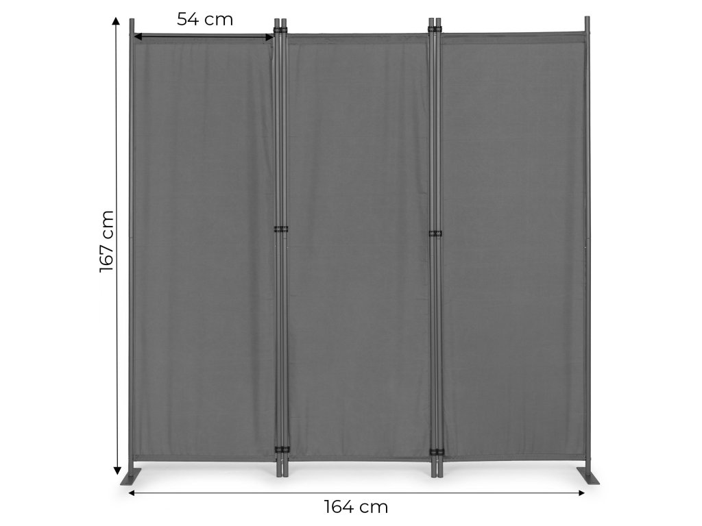Zahradní paraván se skládá ze 3 panelů o celkové šířce 164 cm. Jejich potah je vyroben z odolného polyesteru o gramáži 160 g/m². Ocelová konstrukce s práškovým lakováním zaručuje odolnost proti povětrnostním vlivům a díky lehké konstrukci lze paraván rychle a snadno postavit na libovolném místě. Skládací systém usnadňuje přenášení a skladování, takže paraván zabírá málo místa, když není potřeba.