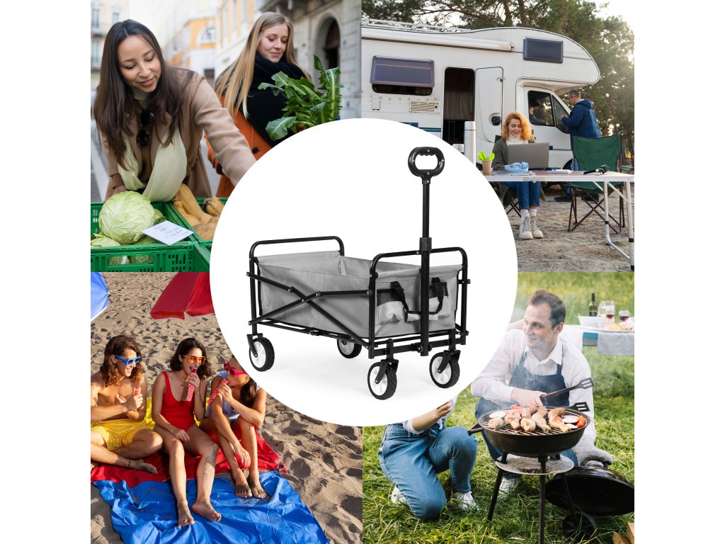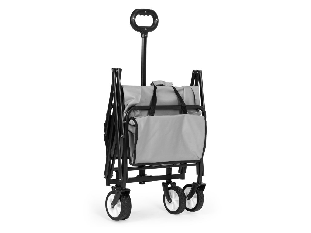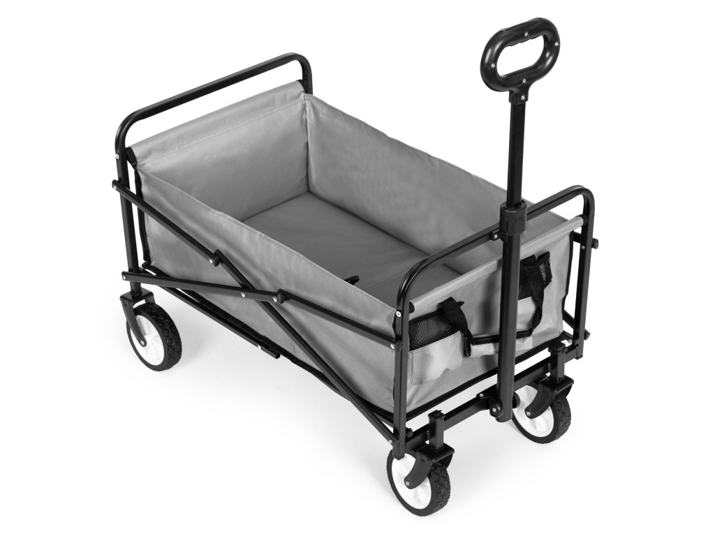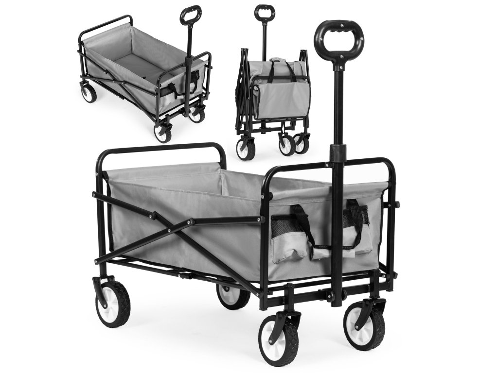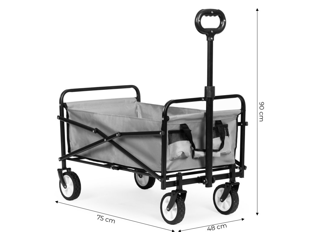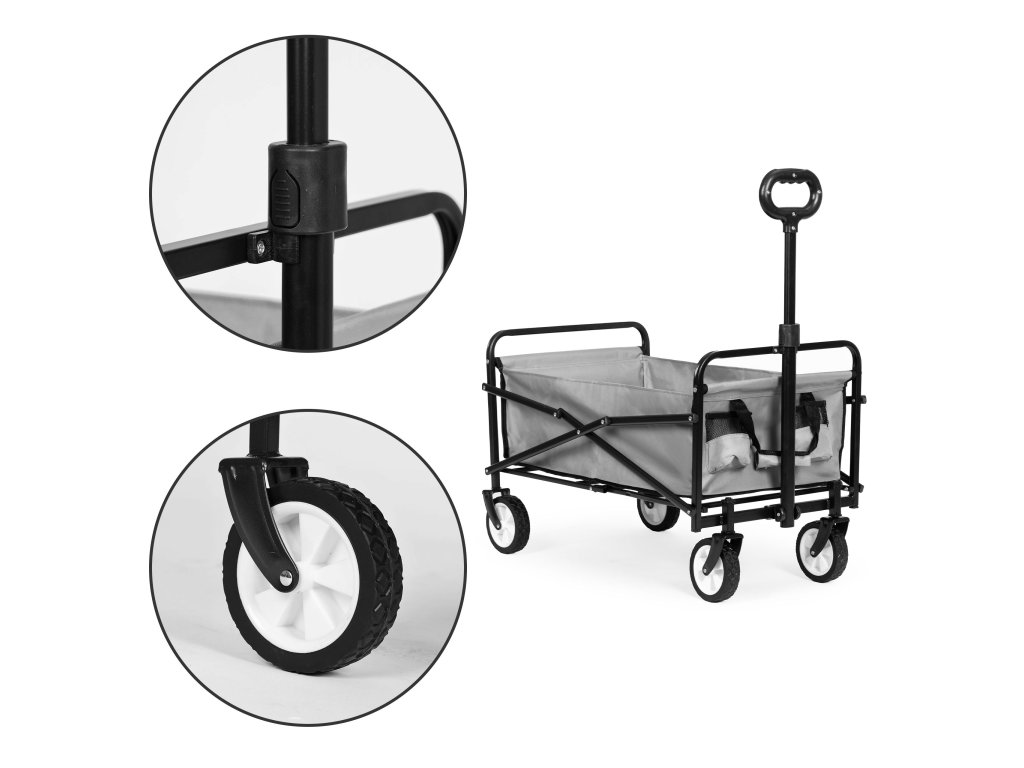 Skládací přepravní vozík je ideální na zahradu, pozemek, pláž a dovolenou. Má pevný kovový rám, voděodolný materiál a velká gumová kola pro odolnost a snadné použití. Vozík je vybaven širokým pohodlným madlem, dvěma praktickými kapsami na nápoje a transportním madlem, které usnadňuje přepravu nákupu, nářadí, zavazadel a plážového vybavení. Maximální zatížení je 100 kg.