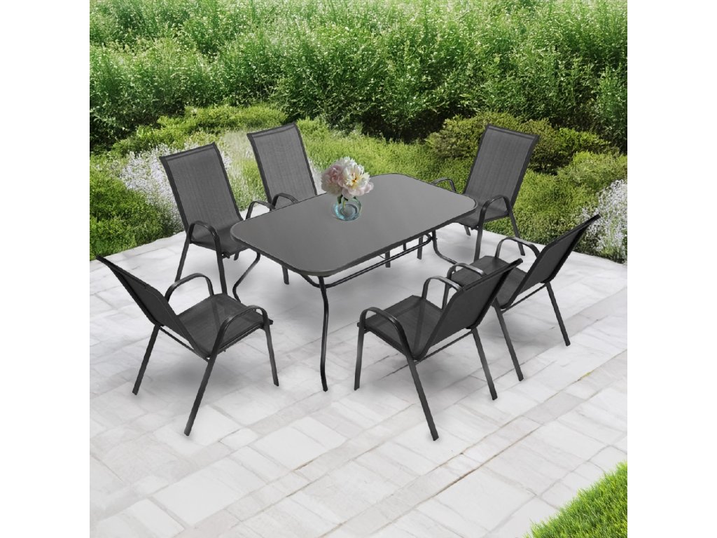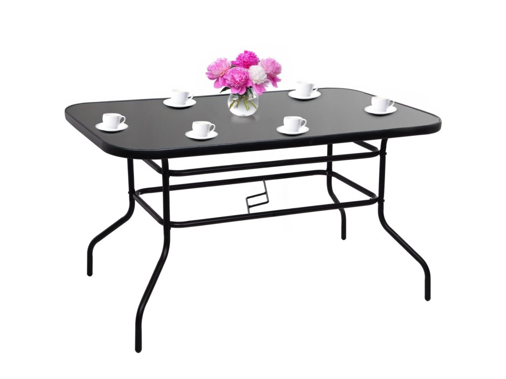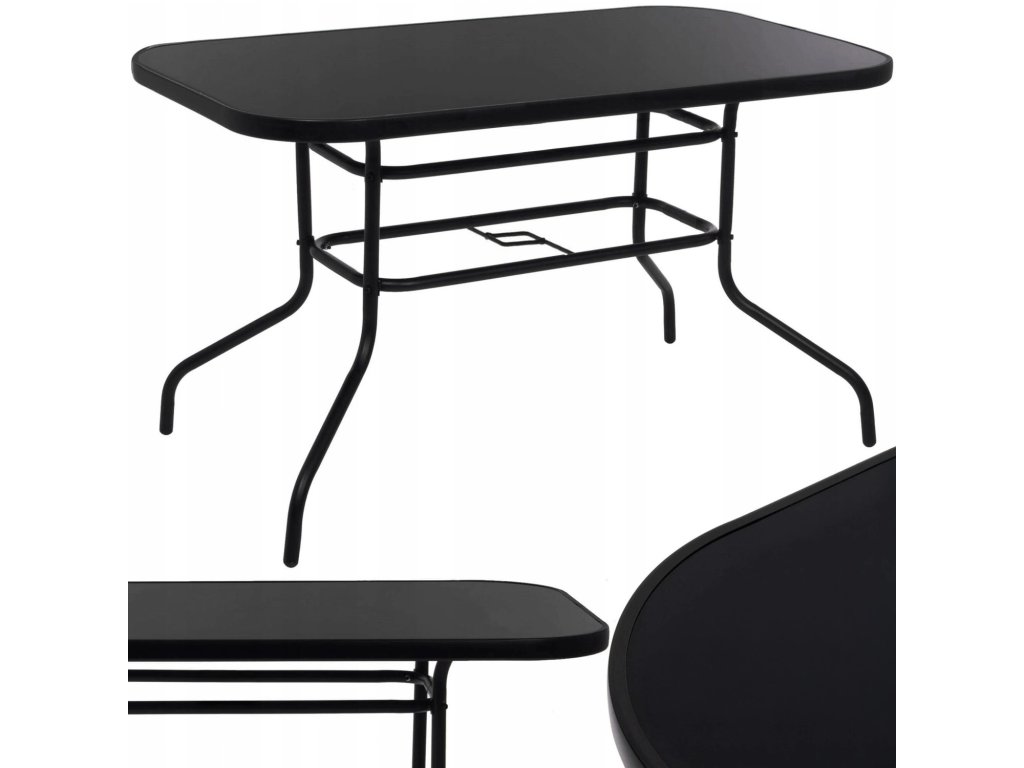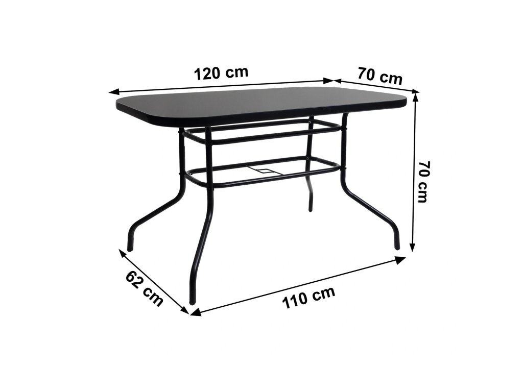 Elegantní zahradní stůl o rozměrech 120x70 cm je ideální na terasu, zahradu nebo balkon. Deska stolu je vyrobena z tvrzeného skla, které zajišťuje trvanlivost a odolnost vůči povětrnostním vlivům, zatímco jeho černá barva dodává moderní nádech. Pevná kovová konstrukce zaručuje stabilitu a odolnost proti korozi. Nohy stolu jsou opatřeny protiskluzovými podložkami, které chrání povrch před poškrábáním a zvyšují bezpečnost. Stůl zaručuje prostor pro 6 osob.