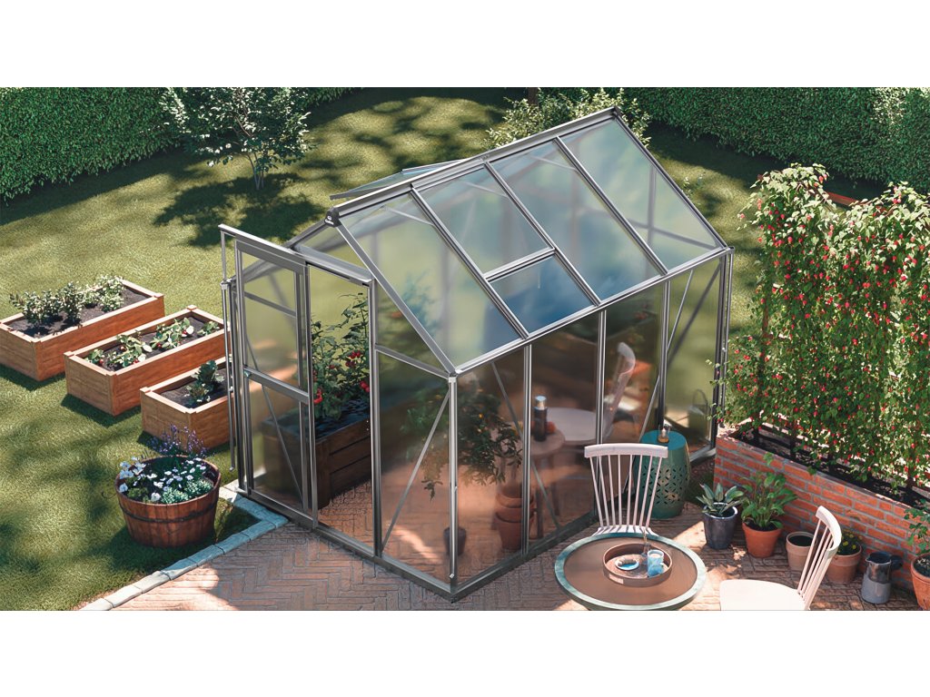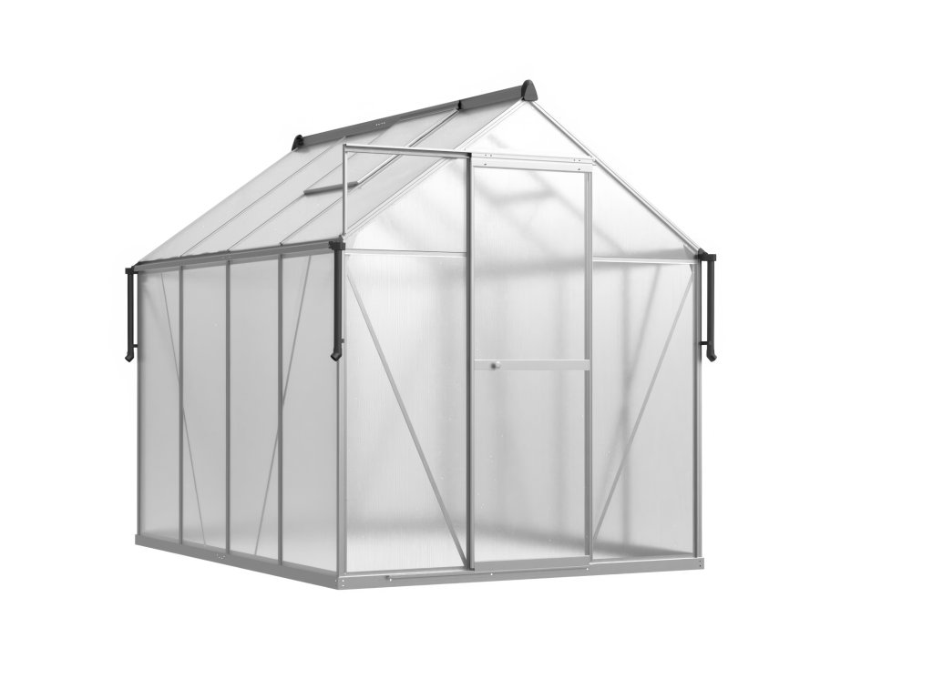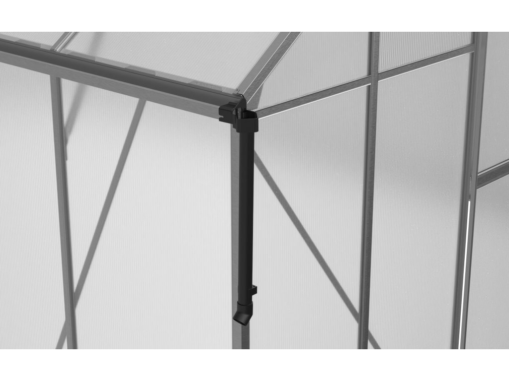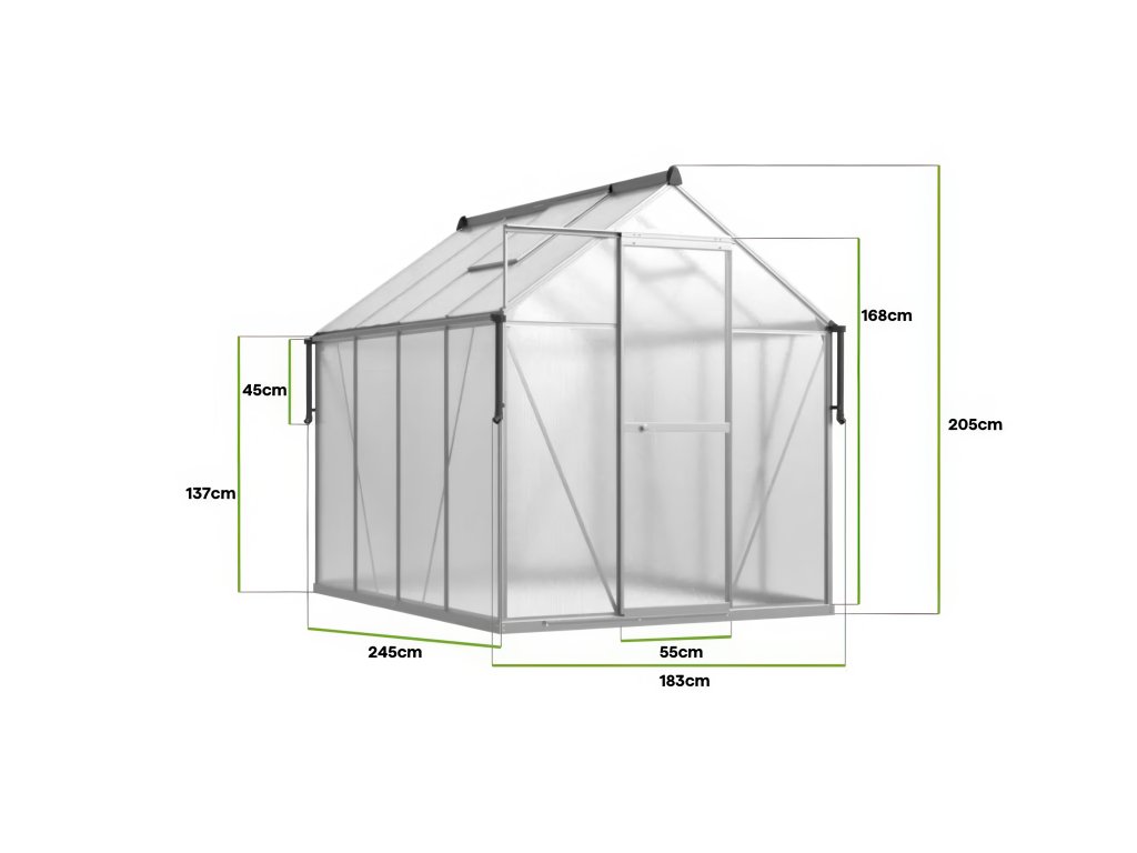 Skleník „Slide-In” 183 x 245 cm je odolné a estetické řešení pro milovníky zahradničení. Je vyroben z 4mm polycarbonátových panelů s UV ochranou, na hliníkovém rámu a pozinkované ocelové základně, což zajišťuje odolnost a stabilitu na dlouhá léta.