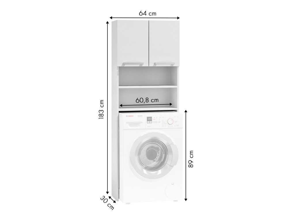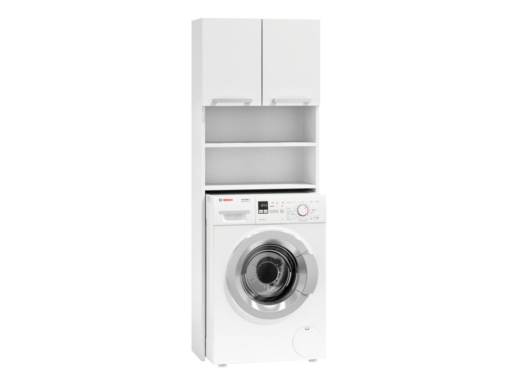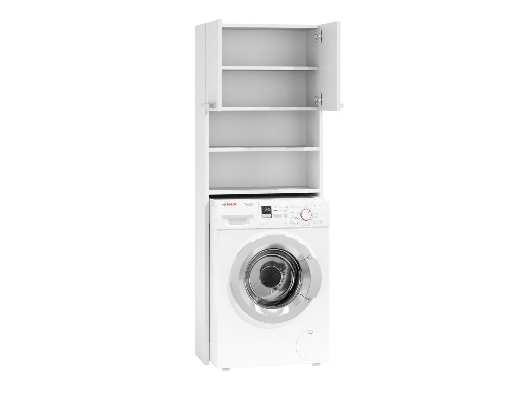 Vertikální koupelnová police je ideálním řešením pro všechny, kteří ocení chytrá řešení. Skříňka byla navržena tak, aby do ní bylo možné umístit pračku. Díky tomu nad pračkou získáváme spoustu využitelného prostoru na dvou otevřených policích a ve skříňce s dvířky. Police a skříňka lze využít k uložení ručníků, čisticích prostředků a dalších koupelnových doplňků, čímž v koupelně získáte pořádek a čistotu.