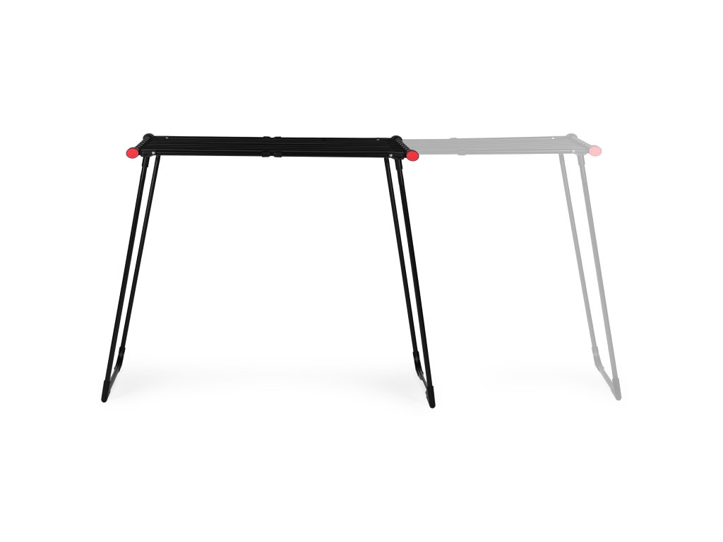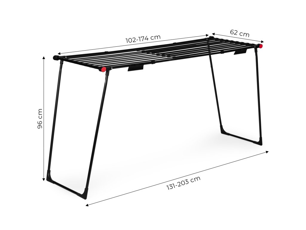 Sušák s rozkládací konstrukcí poskytuje až 19 metrů sušící plochy, což umožňuje pohodlně pověsit i větší množství prádla. Je vyroben z odolné práškově lakované oceli a vyznačuje se vysokou stabilitou a odolností při každodenním používání – jak doma, tak venku. Nastavitelná délka od 102 do 174 cm usnadňuje přizpůsobení sušáku dostupnému prostoru.