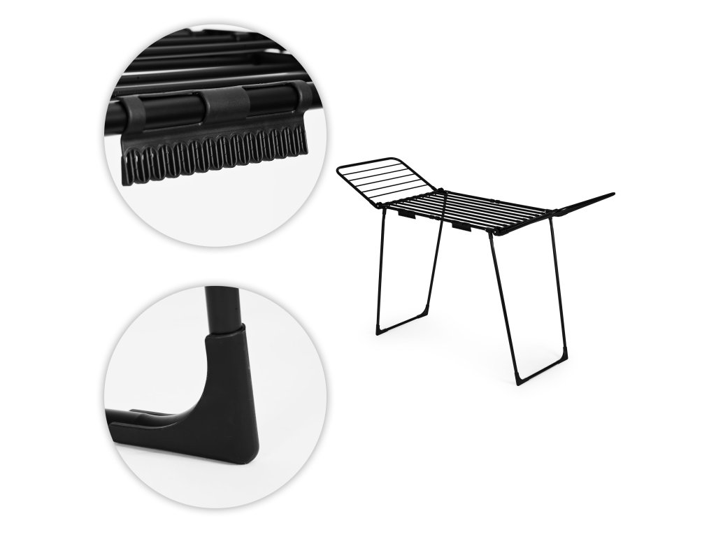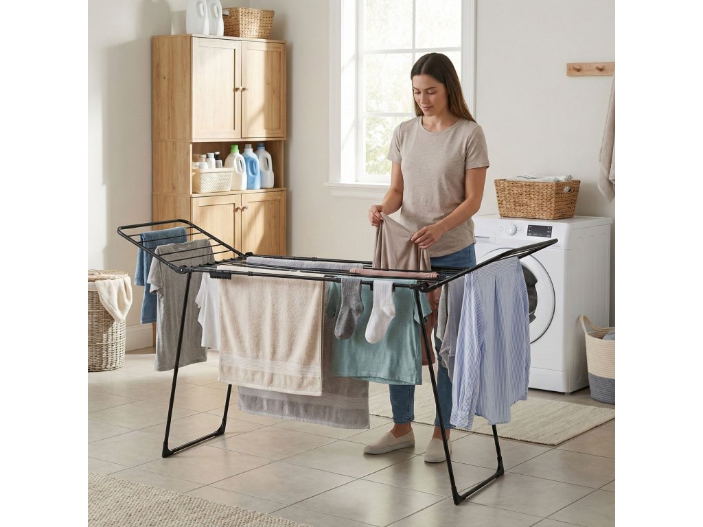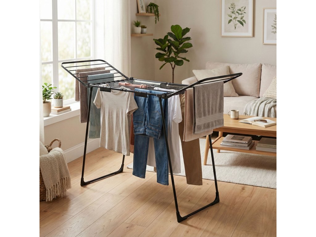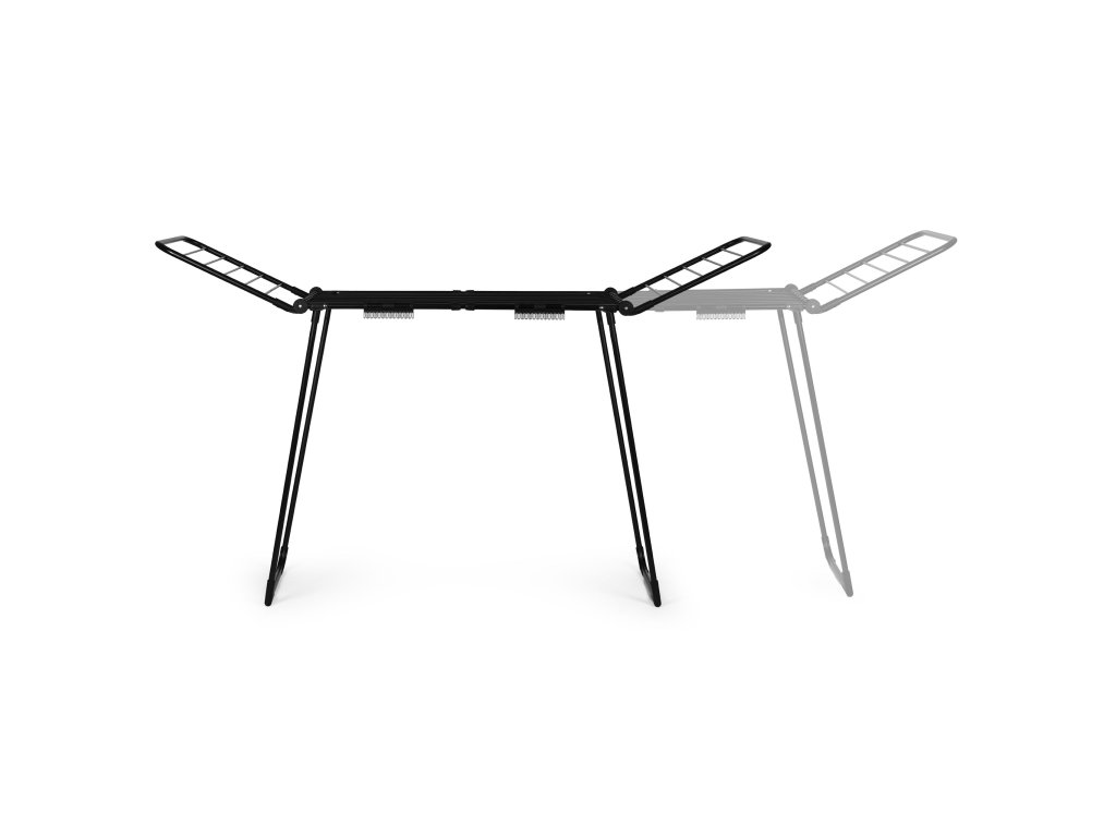 Sušák byl navržen s ohledem na pohodlné skladování – skládání je rychlé, intuitivní a nevyžaduje žádnou sílu. Po sklopení zabírá minimální množství místa, takže se snadno vejde do skříně, za dveře nebo vedle pračky. Praktický systém zajištění křídel navíc zabraňuje nechtěnému rozložení konstrukce, což usnadňuje přenášení a bezpečné skladování.