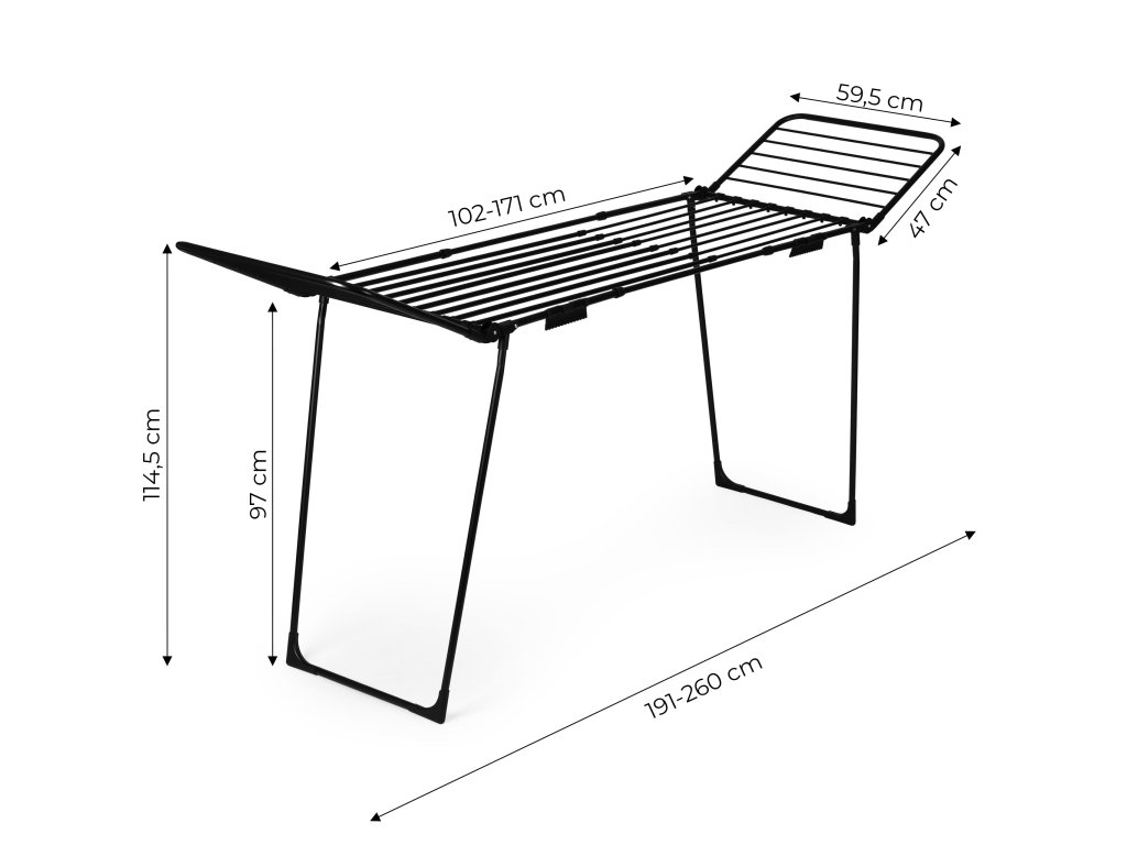 - Teleskopický výsuvný systém umožňuje přizpůsobit délku sušáku aktuálním potřebám. Výsuvné lišty zvětšují užitnou plochu, když máte více prádla, a ve složeném stavu šetří místo.
