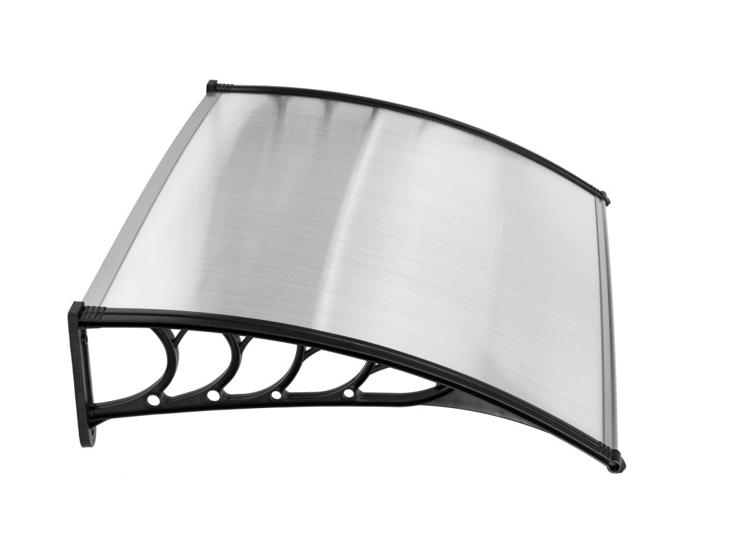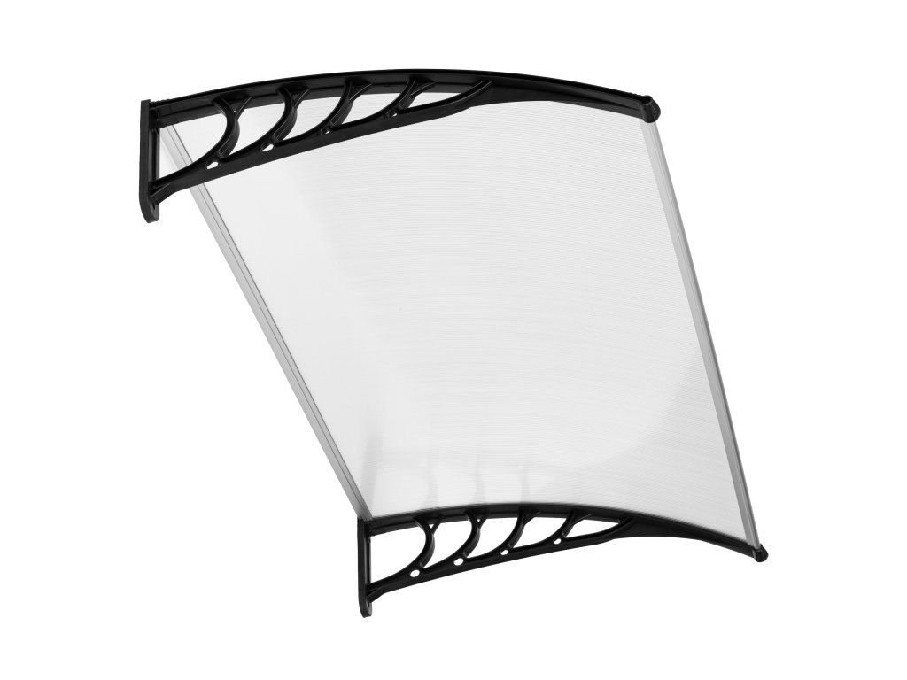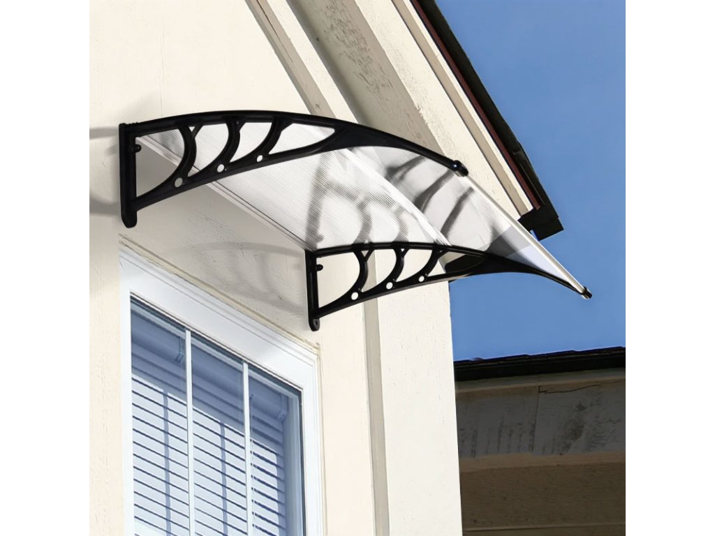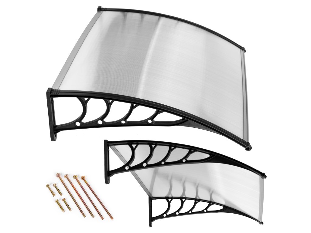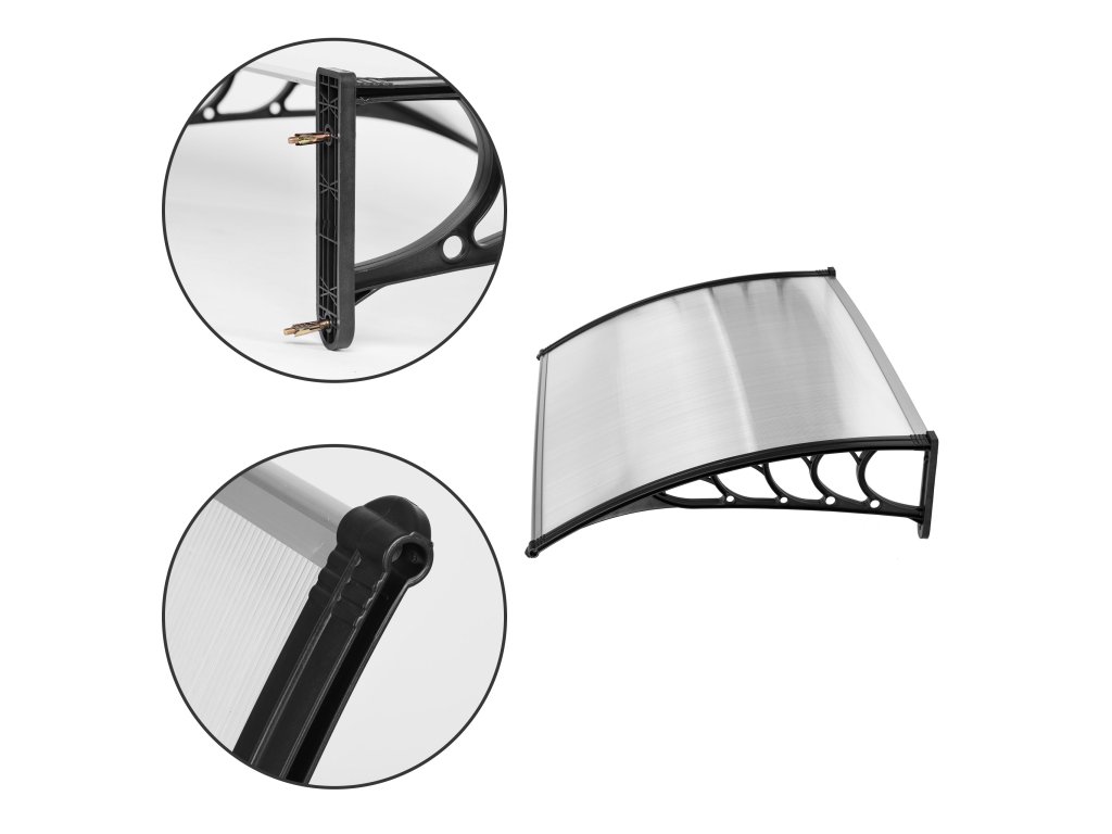 Boční prvky stříšky, které drží celou konstrukci, jsou vyrobeny z odolného plastu, díky čemuž je konstrukce odolná vůči silným poryvům větru. Stříška se připevňuje k fasádě pomocí 4 šroubů, které najdete v sadě.