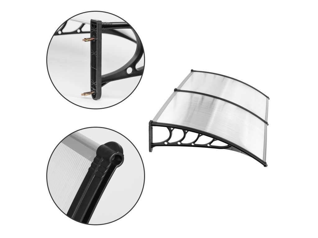 - Boční prvky podpírající konstrukci jsou vyrobeny z odolného plastu, díky čemuž je konstrukce odolná vůči silnému větru. Stříška se k fasádě připevňuje pomocí 6 šroubů, které jsou součástí sady.