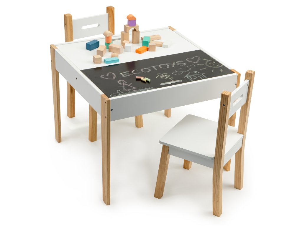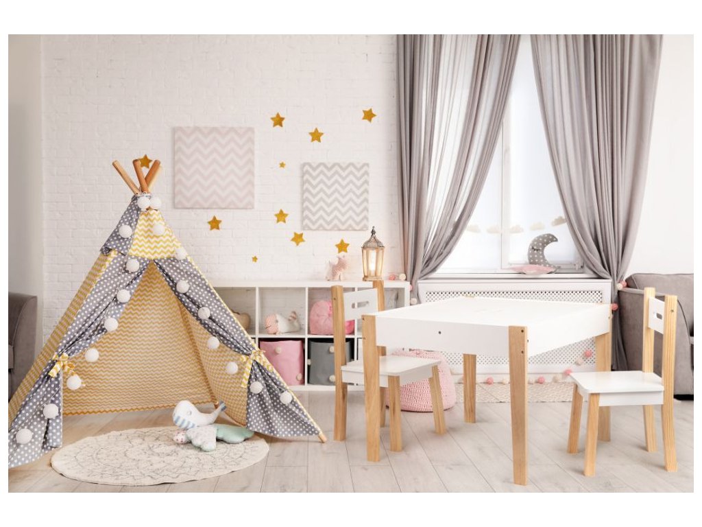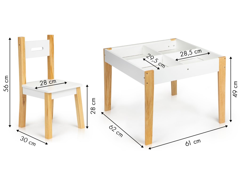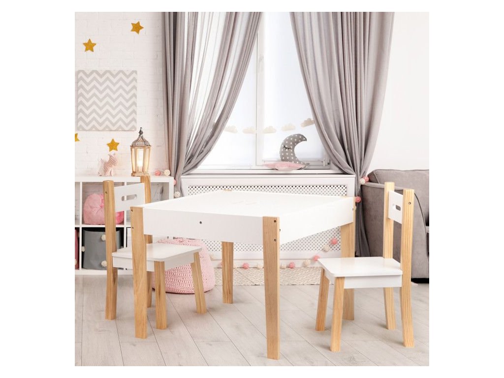 Sada nábytku pro děti se skládá ze stolku a 2 židlí. Sada je vyrobena z lakované MDF desky a má pěkně zpracované borovicové nohy. Stůl má dvoudílnou odnímatelnou desku, pod kterou se skrývají 4 přihrádky, které pomáhají rychle uklidit hračky. Jedna část desky může sloužit jako tabule na psaní křídou.