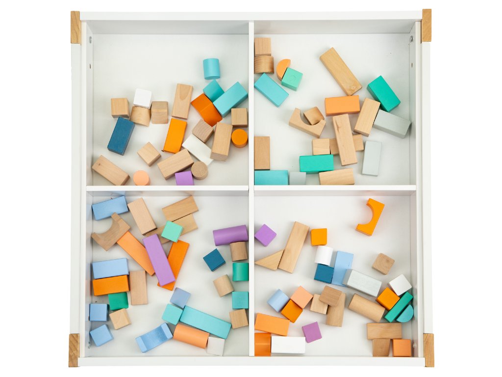 Pod deskou stolu je skrytý organizér, který pomáhá udržovat pořádek a rozvíjet zvyk uklízet po hraní. K dispozici jsou 4 prostorné přihrádky, do kterých se vejdou kostky, hračky, kreslící potřeby a dokonce i knihy.