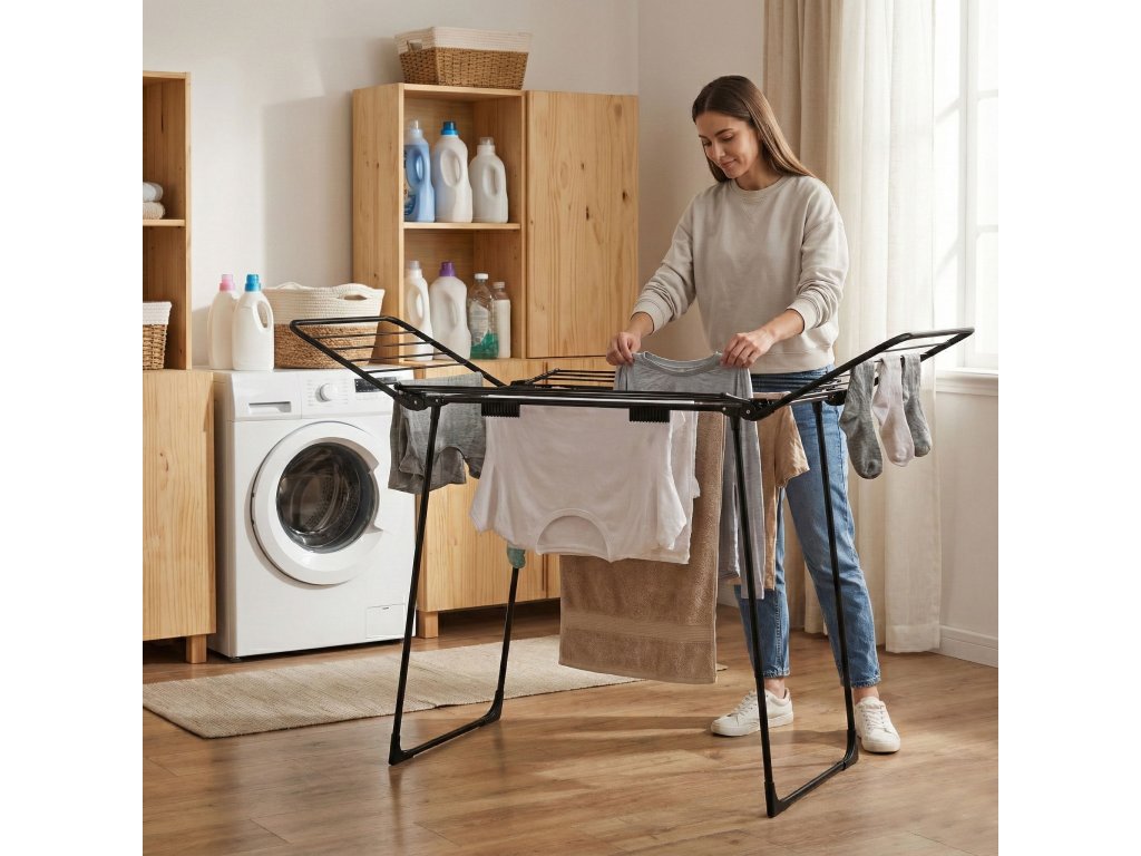 Sušák byl navržen s ohledem na pohodlné skladování – jeho sklopení je rychlé, intuitivní a nevyžaduje žádnou sílu. Po sklopení zabírá minimální množství místa, takže se snadno vejde do skříně, za dveře nebo vedle pračky. Navíc je vybaven praktickou křídlovou pojistkou, která zabraňuje náhodnému rozložení, což usnadňuje bezpečné přenášení a skladování sušáku.