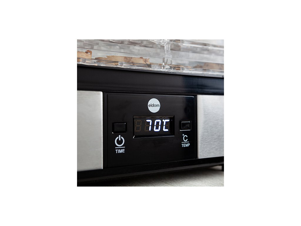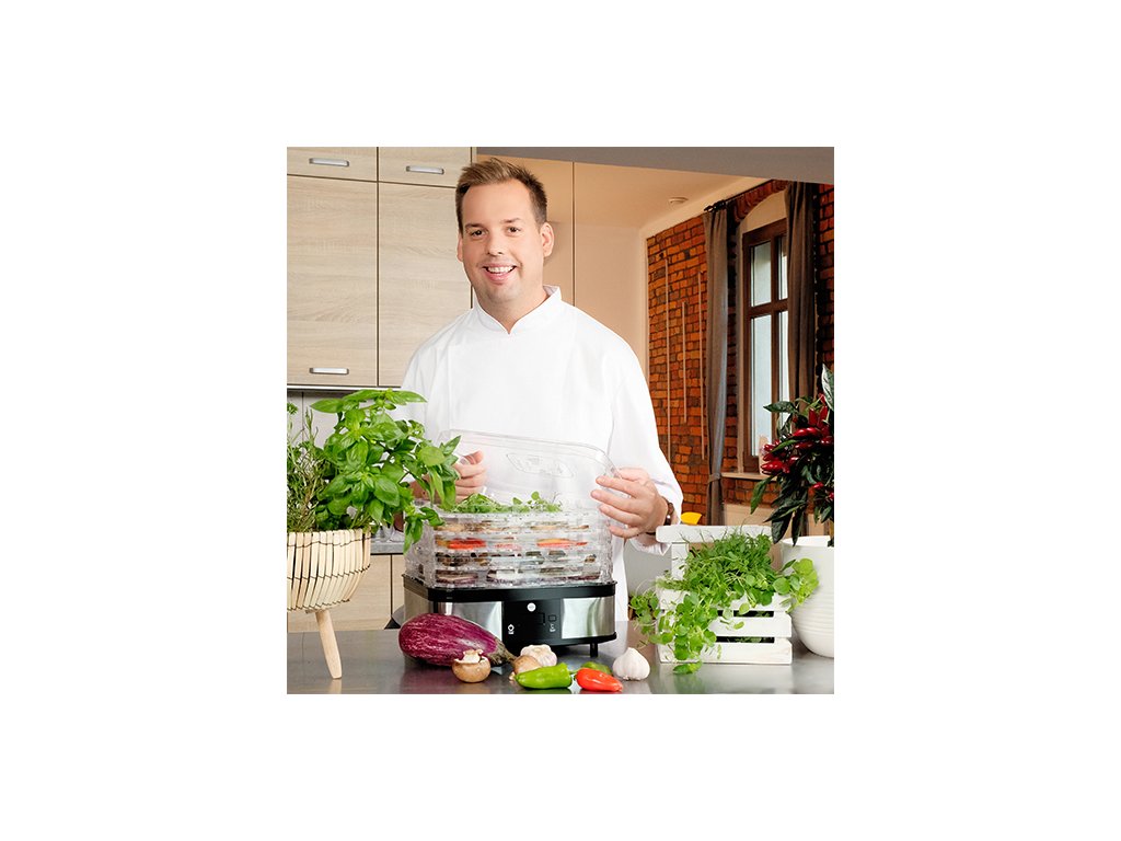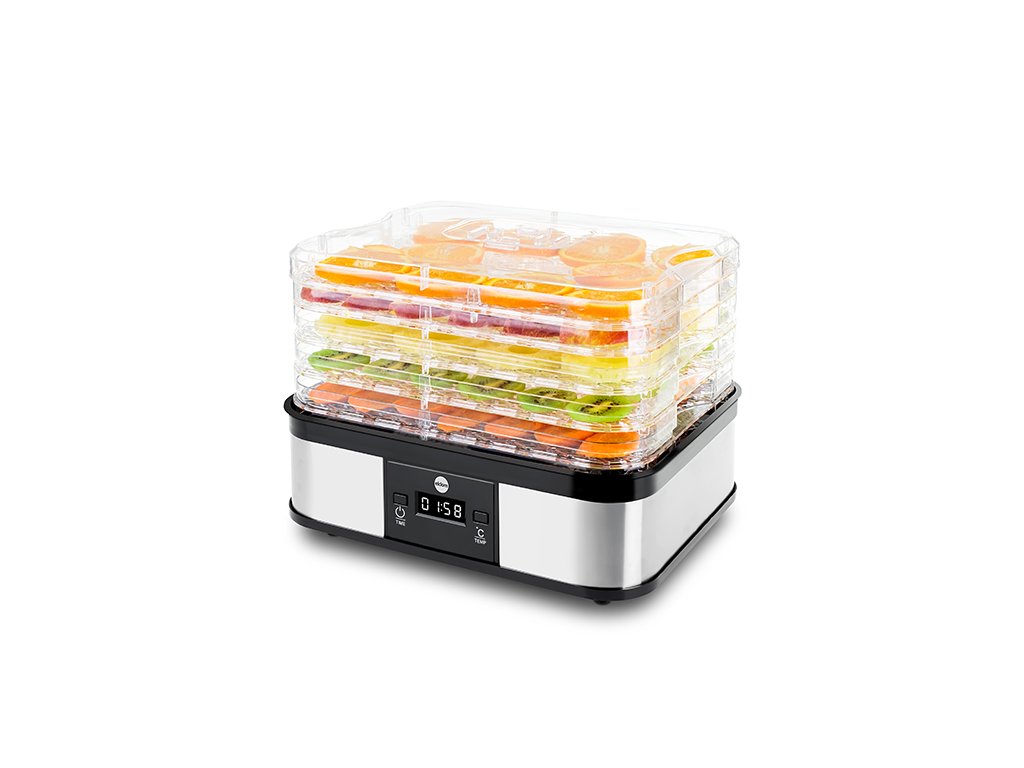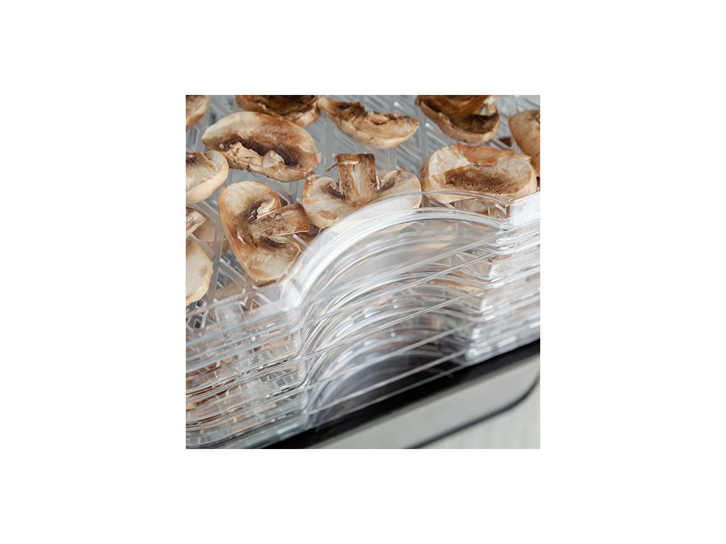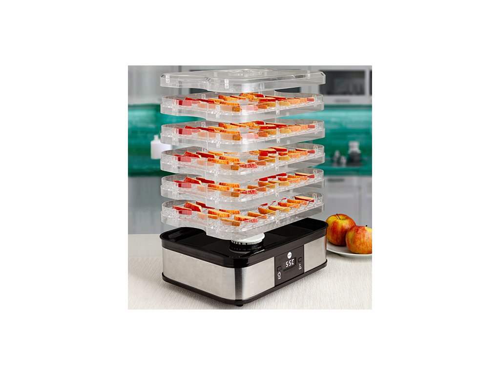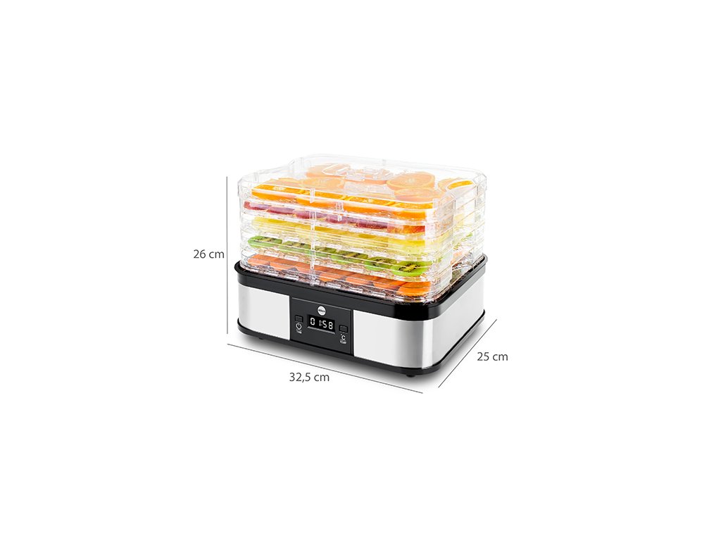 Sušička potravin má 5 úrovní a na každé z nich se nachází tác o rozměrech 30 x 23 cm. Teplota se dá nastavit v rozmezí 40-70 °C. Další výhodou je časovač v rozmezí od 1 hodiny do 48 hodin.