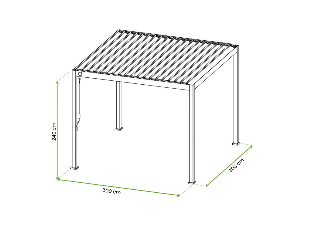 Střešní lamely pergoly jsou nastavitelné v rozmezí 0° až 90°, což umožňuje plynulou změnu úhlu sklonu. Poloha 0° poskytuje ochranu před sluncem a deštěm, zatímco nastavení 90° umožňuje úplné otevření střechy, čímž se maximalizuje větrání a přístup světla.